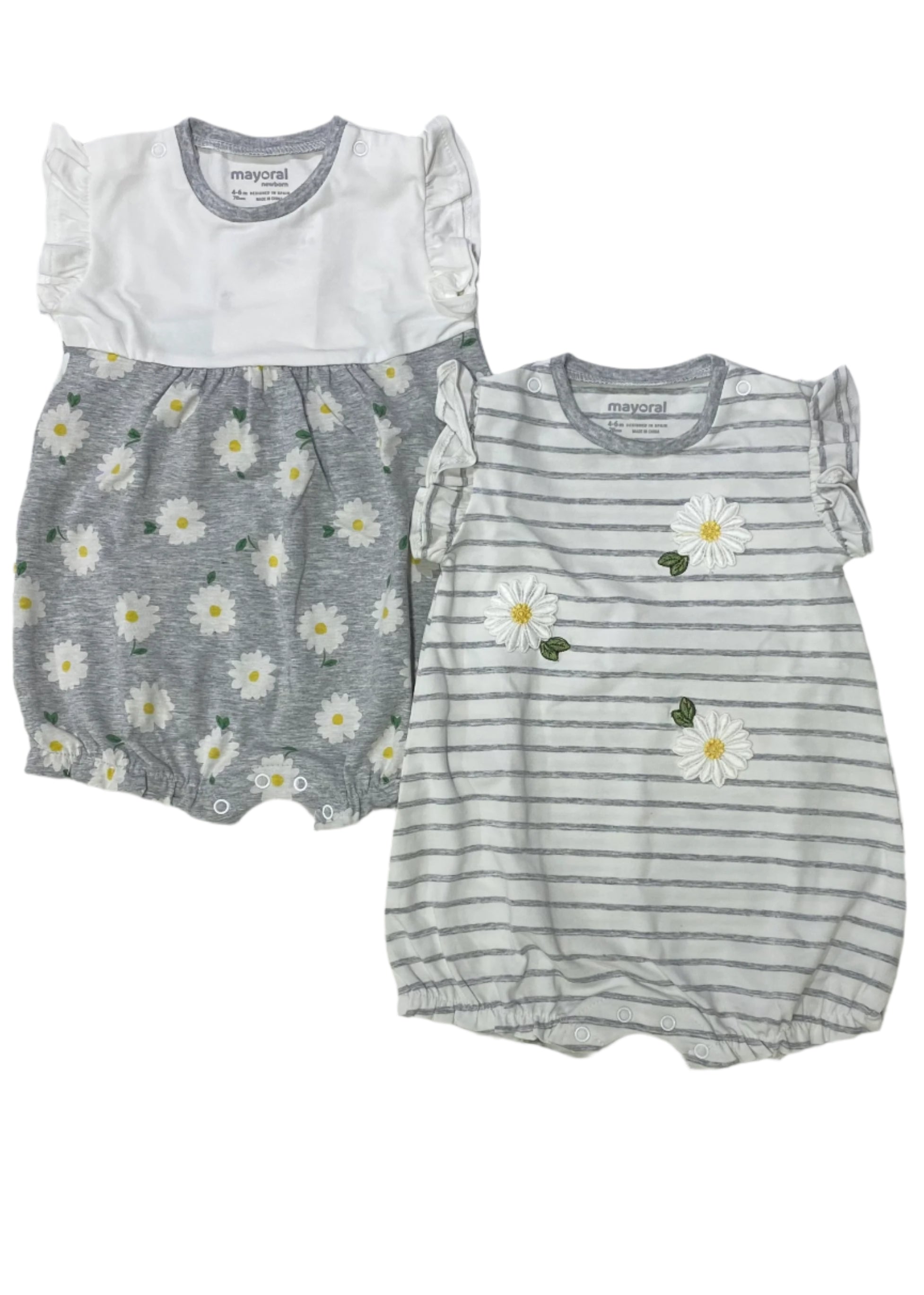 Lovely 2 pc shortie in a box. Both shorties are elasticated on the hem and has sunflower print and embroidery with stripe details. Snap button fastening on the shoulders and in between legs.