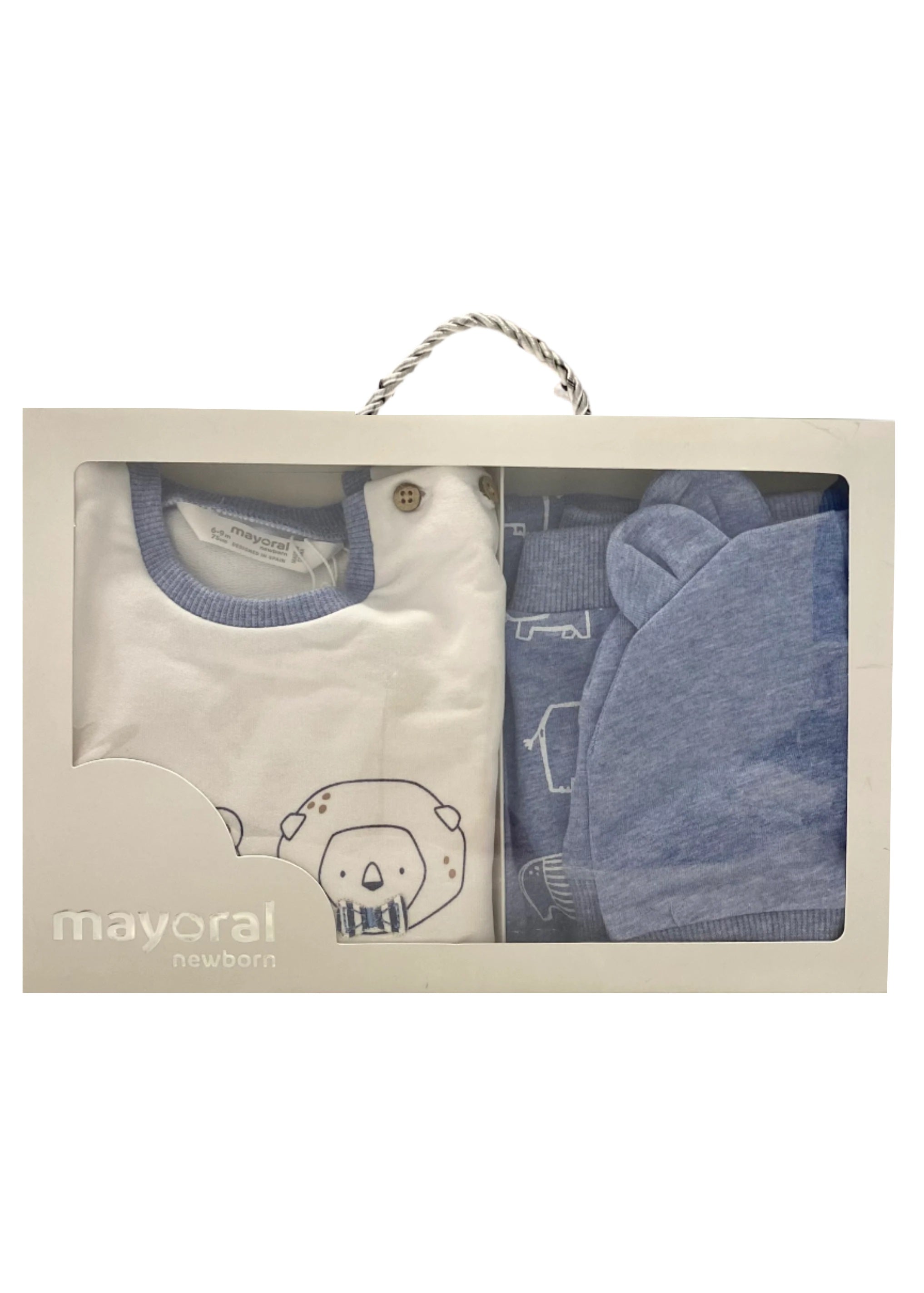 Baby boy 3 pc outfit set. Long sleeve top, rib knit on collar and on hem. Matching pants has an all over animal drawing, open feet for bigger size. Top and pants is perfectly matched with a plain colored hat.