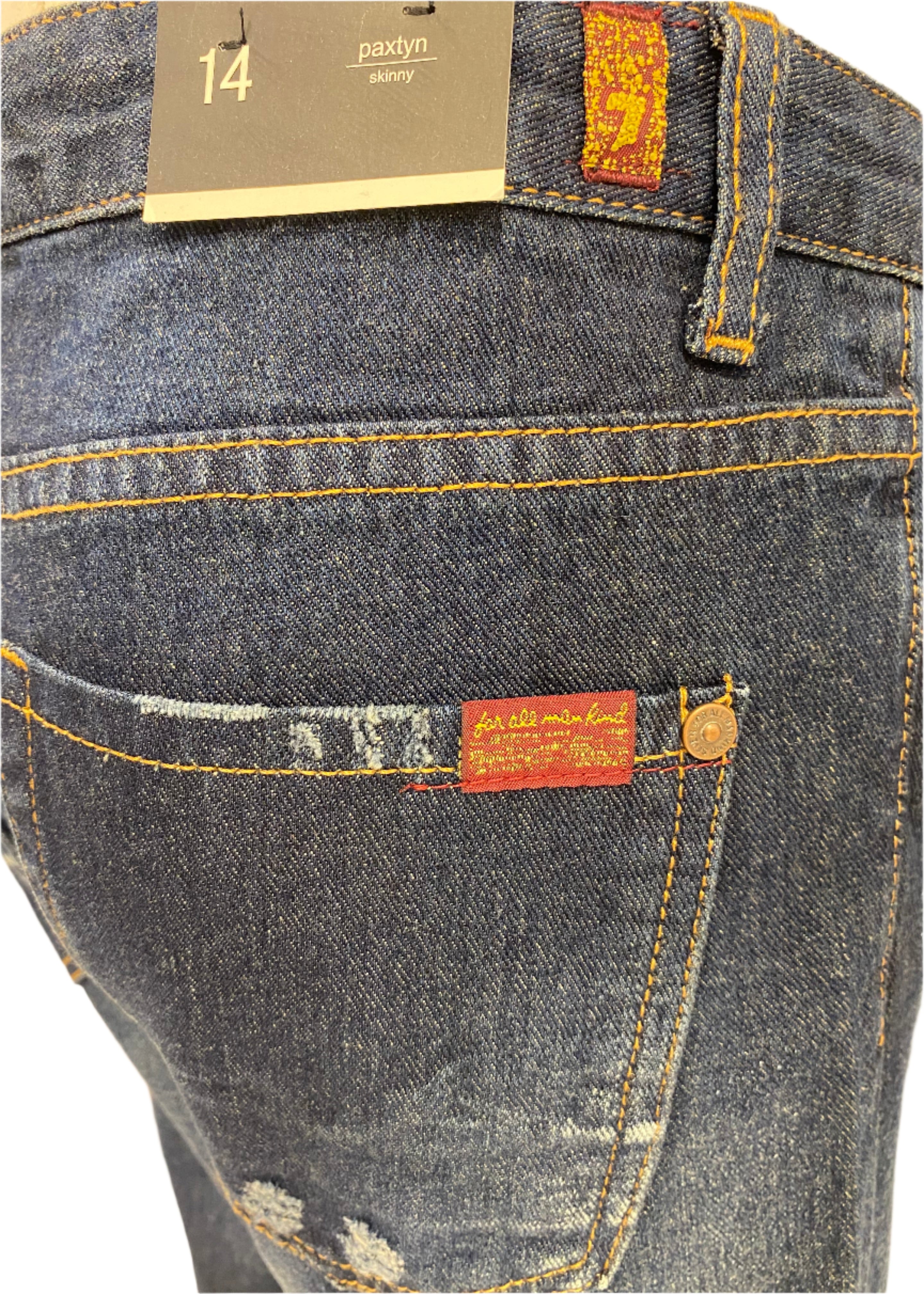 Soft skinny type of jeans designed with pockets front and back, it has also a coin pocket at the right side. Adjustable waistband. Faded and destroyed in style. 7 for all mankind U.S brand.