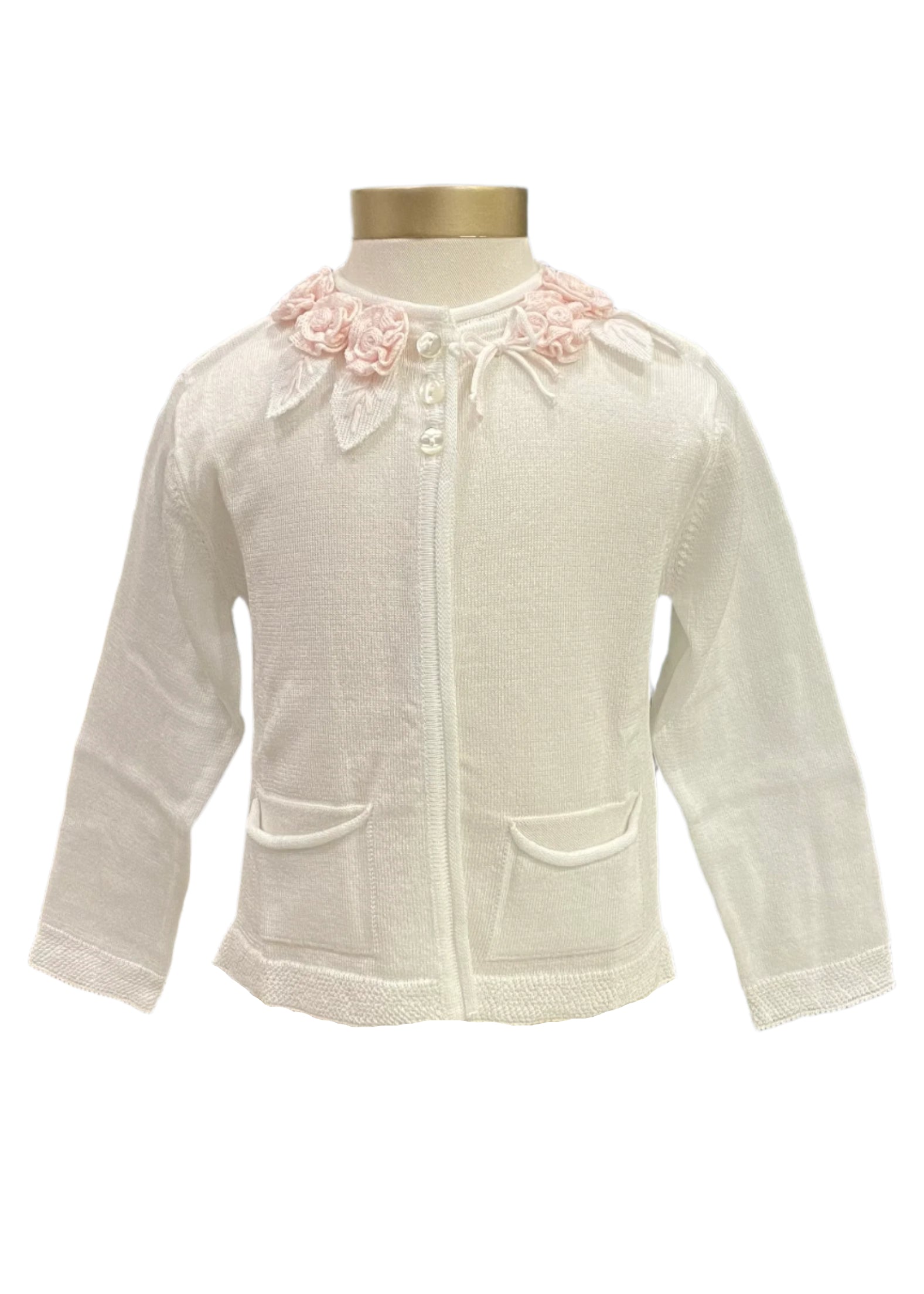 White knitted cardigan for baby girls by Aletta. With pink flower organza and white pink tie below neckline. Embroidered sleeve cuff.