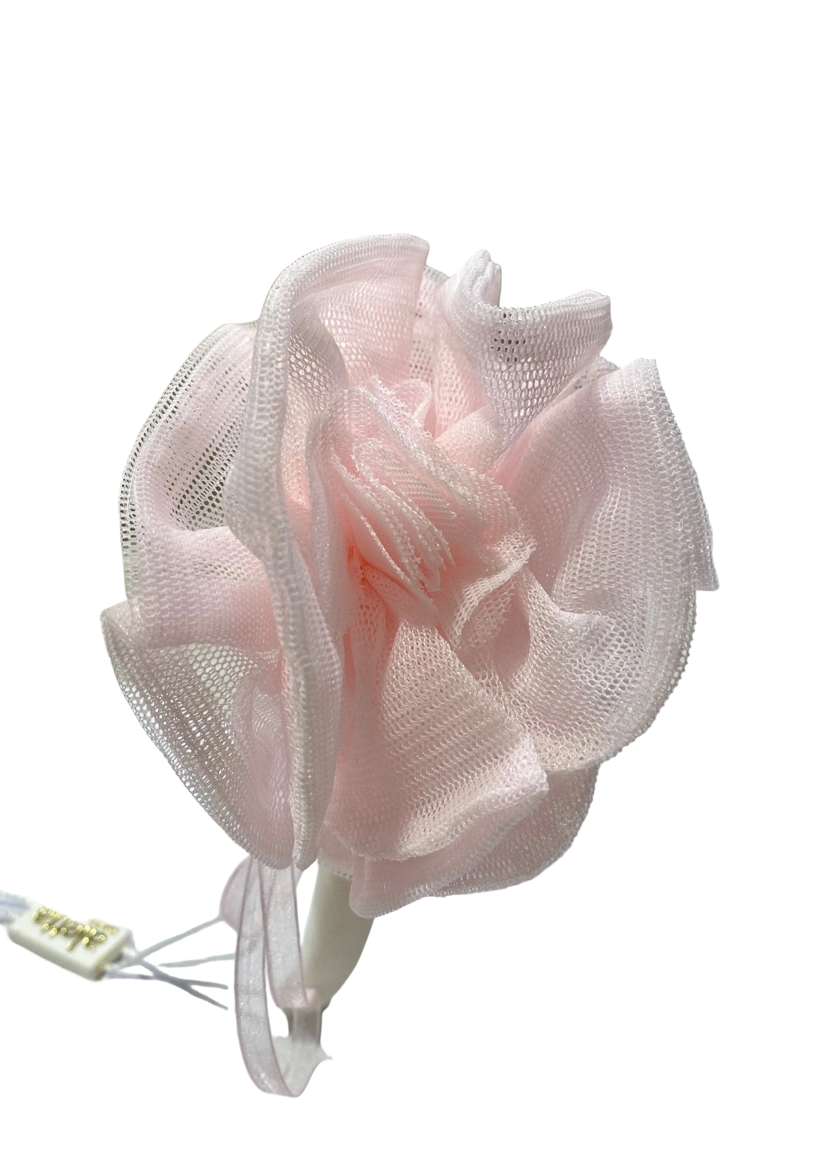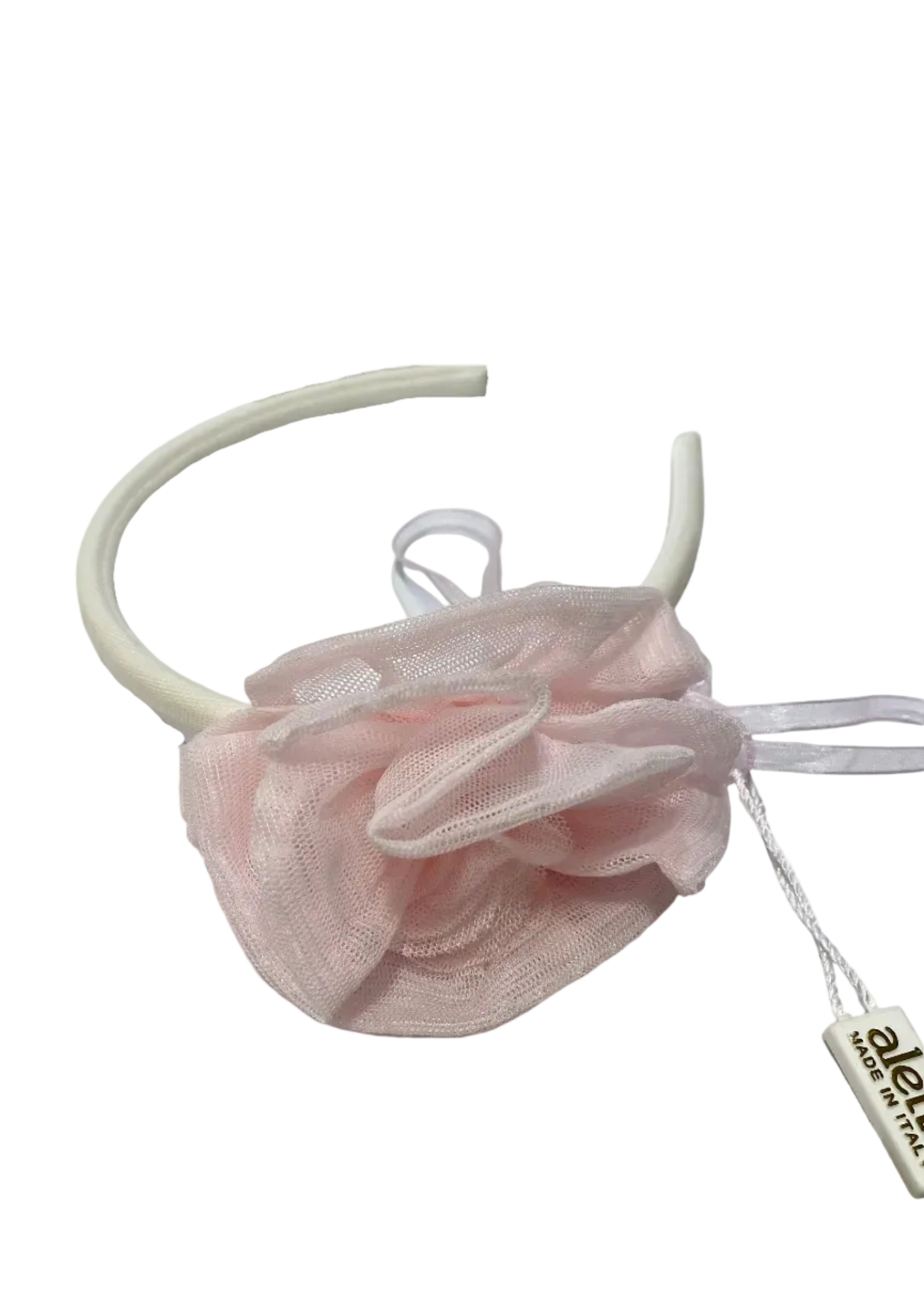 A white lovely headband, designed with an adorable pink rose ornament. A product of Aletta from Italy.