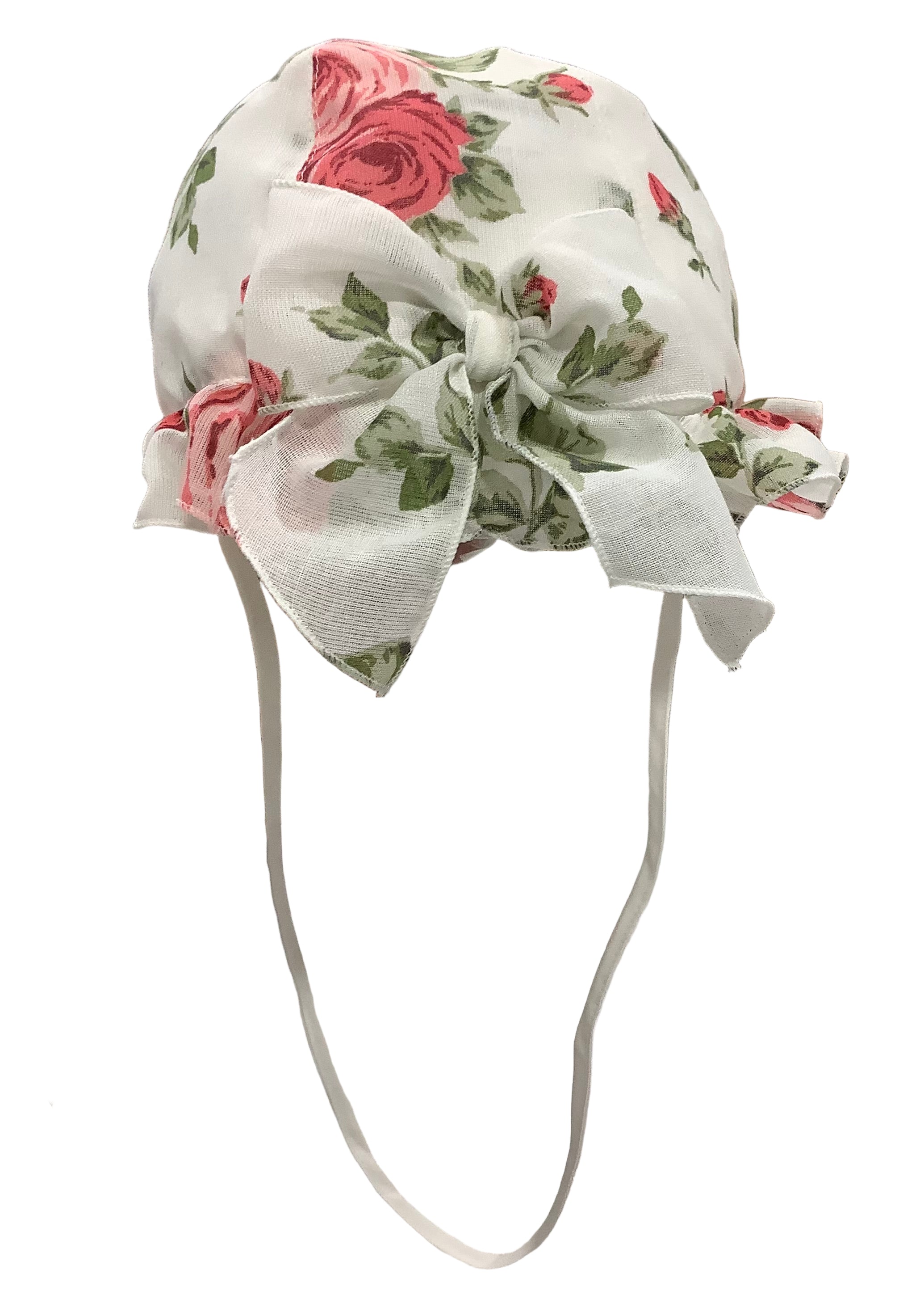 Lovely floral printed hat that has semi wide frilled brim. Decorated with a floral printed medium bow at the back. Fastens with a tie below the chin. Made in Italy by Aletta.