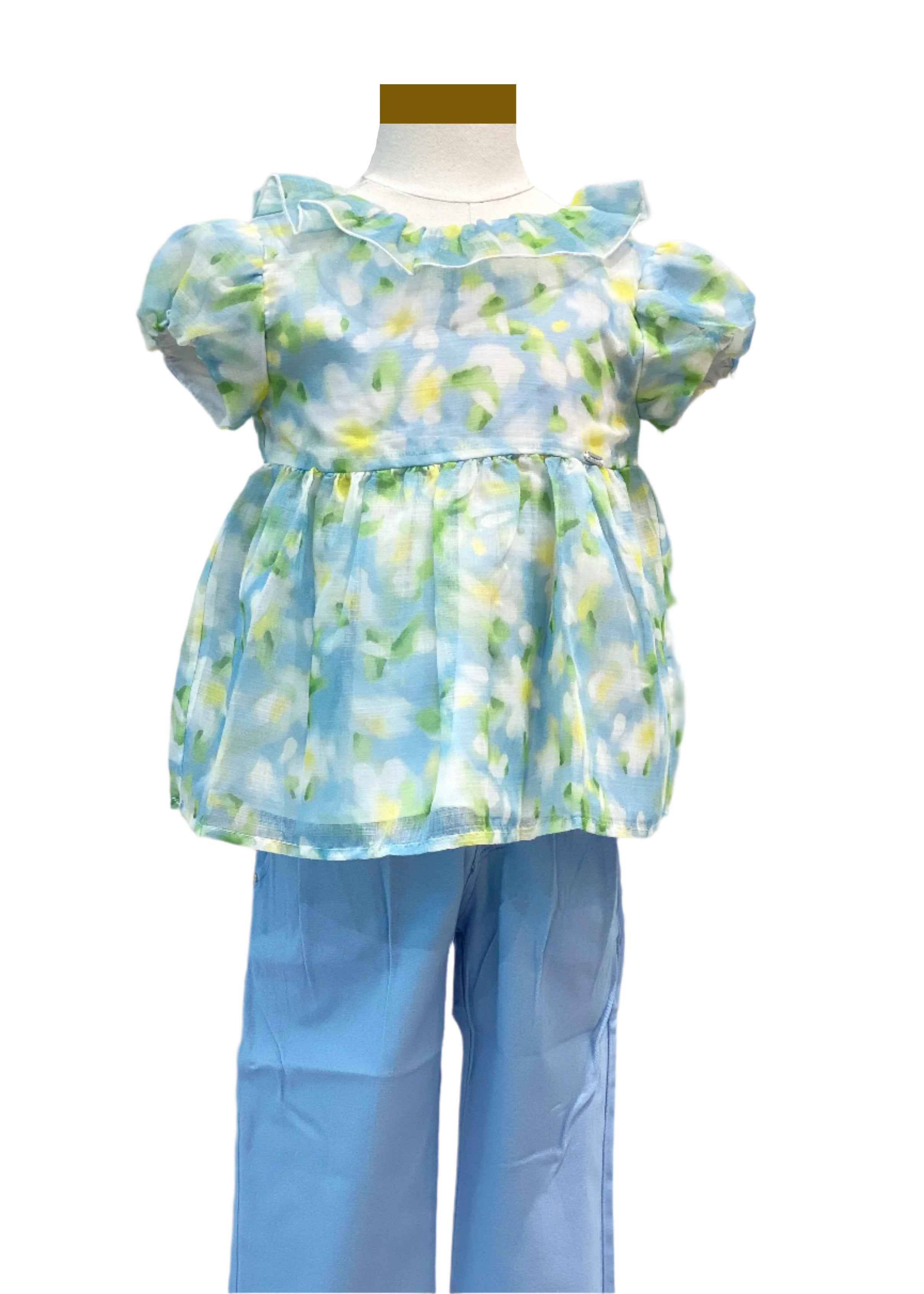 Chic girl's outfit. This set comes with a lovely top with floral patter design, it is puff on the sleeves with ruffle collar, it has zip fastening at the back with bow. The top is matched with a stylish slouchy trouser with pleat design on the pockets ang waistband.
