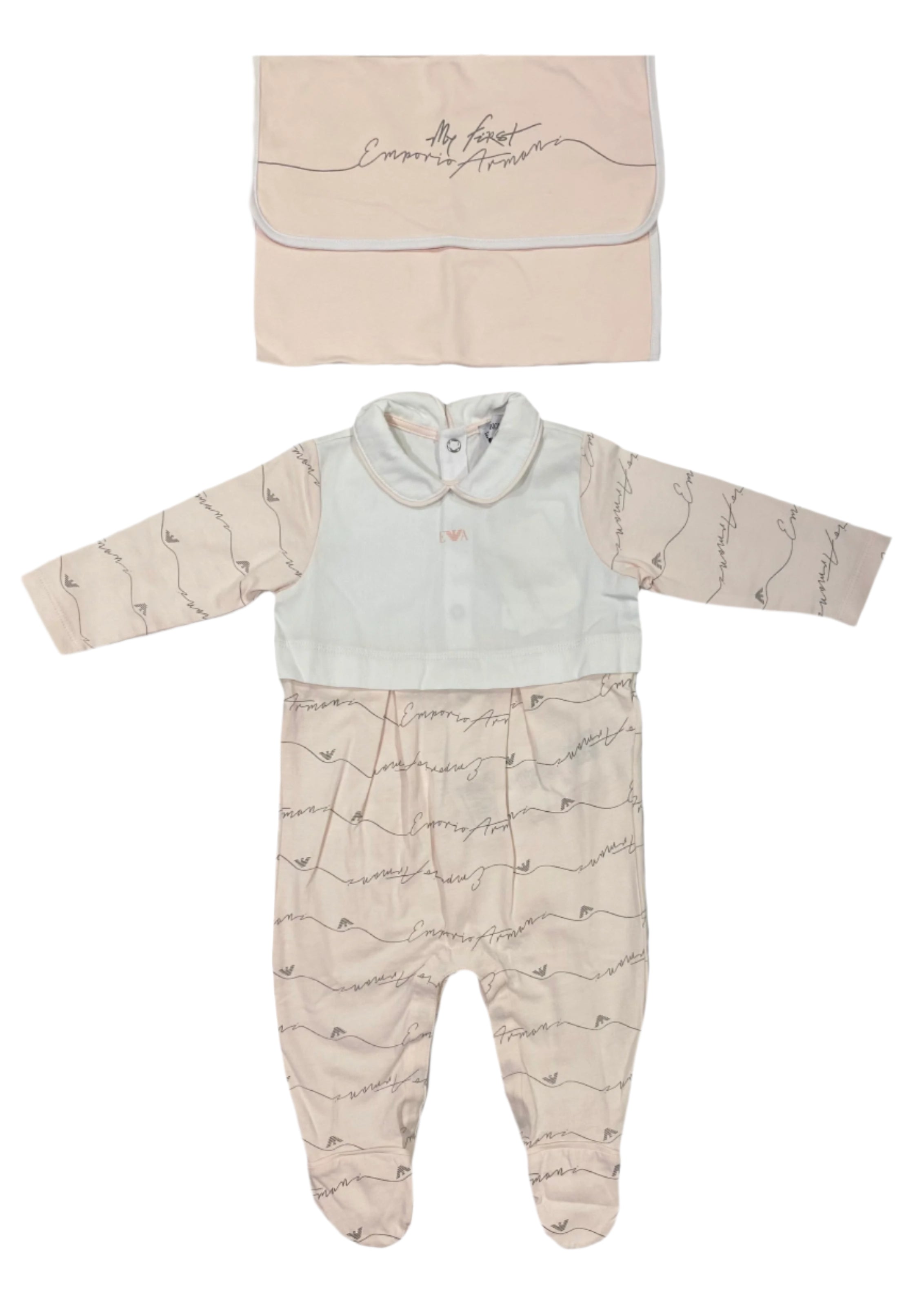 Baby girls pale pink and white baby grow. Made in cotton jersey with an attached cotton bodice, this piece features a white collar with pink trims, a branded has 'EA' logo on the chest and an allover signature print on the bottoms and sleeves. Snap button on the back and between the legs for easy changing.