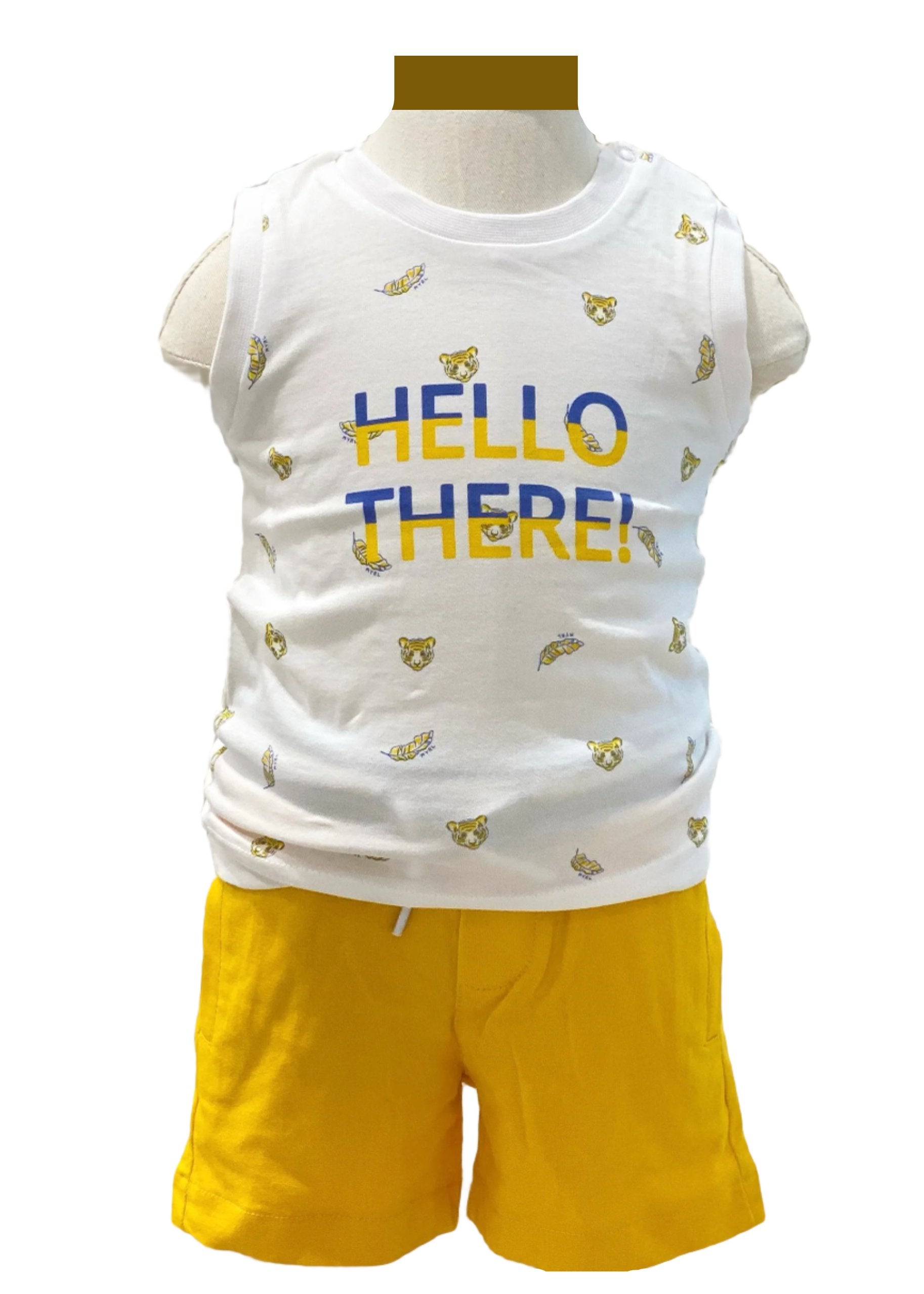 Sleeveless top, all over printed with tiger, has button snap on left shoulder for easy wearing. This top is matched with a soft short, has pockets, elasticated stripe waistband with pull string. This set is soft and comfortable wear.