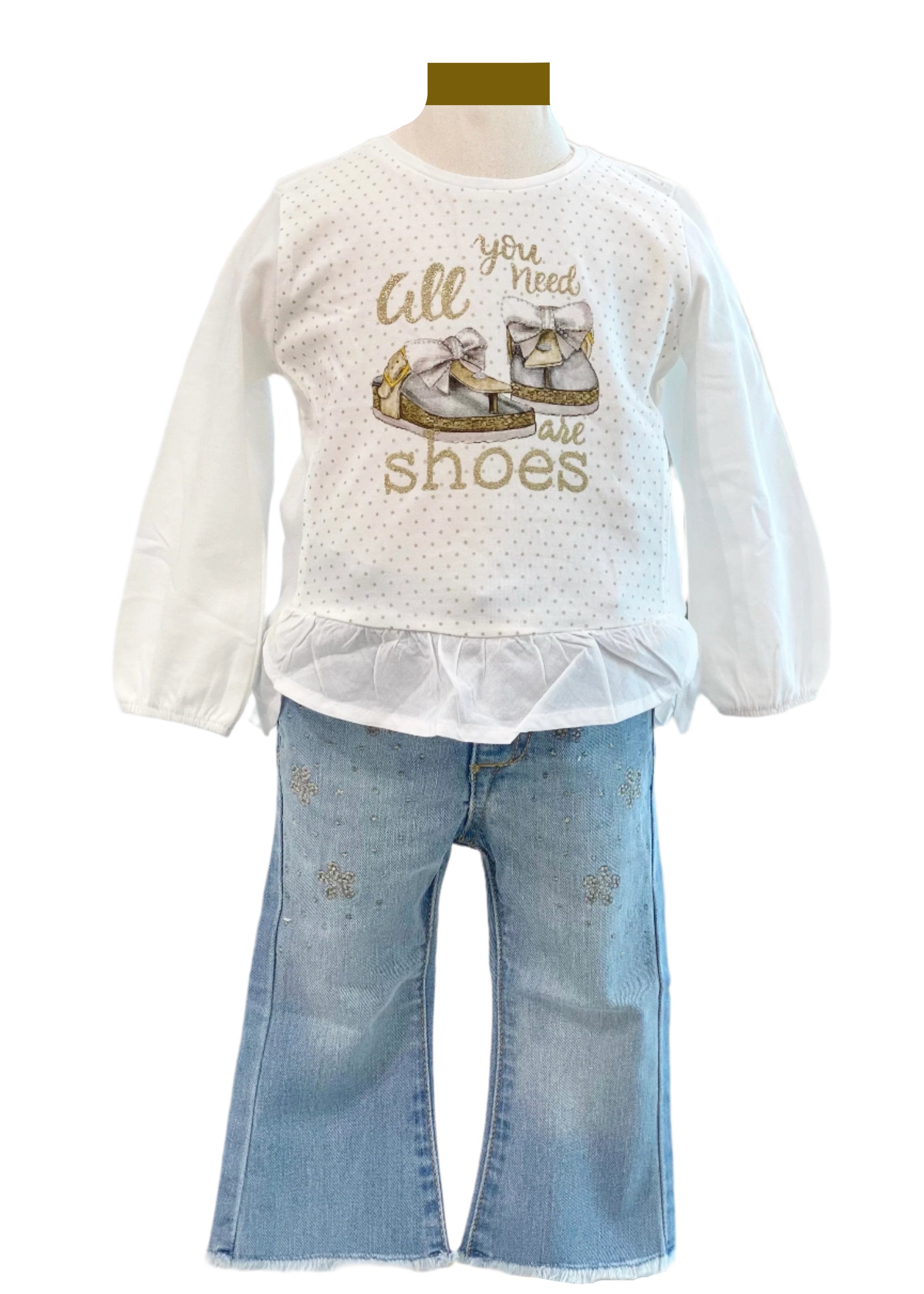 Cool baby girl pants set with belt. This set comes with a long sleeve top, designed with mini polka and slipper print, ruffle on the hem. The top is matched with a semi-bootleg pants with mini dots and flower design.