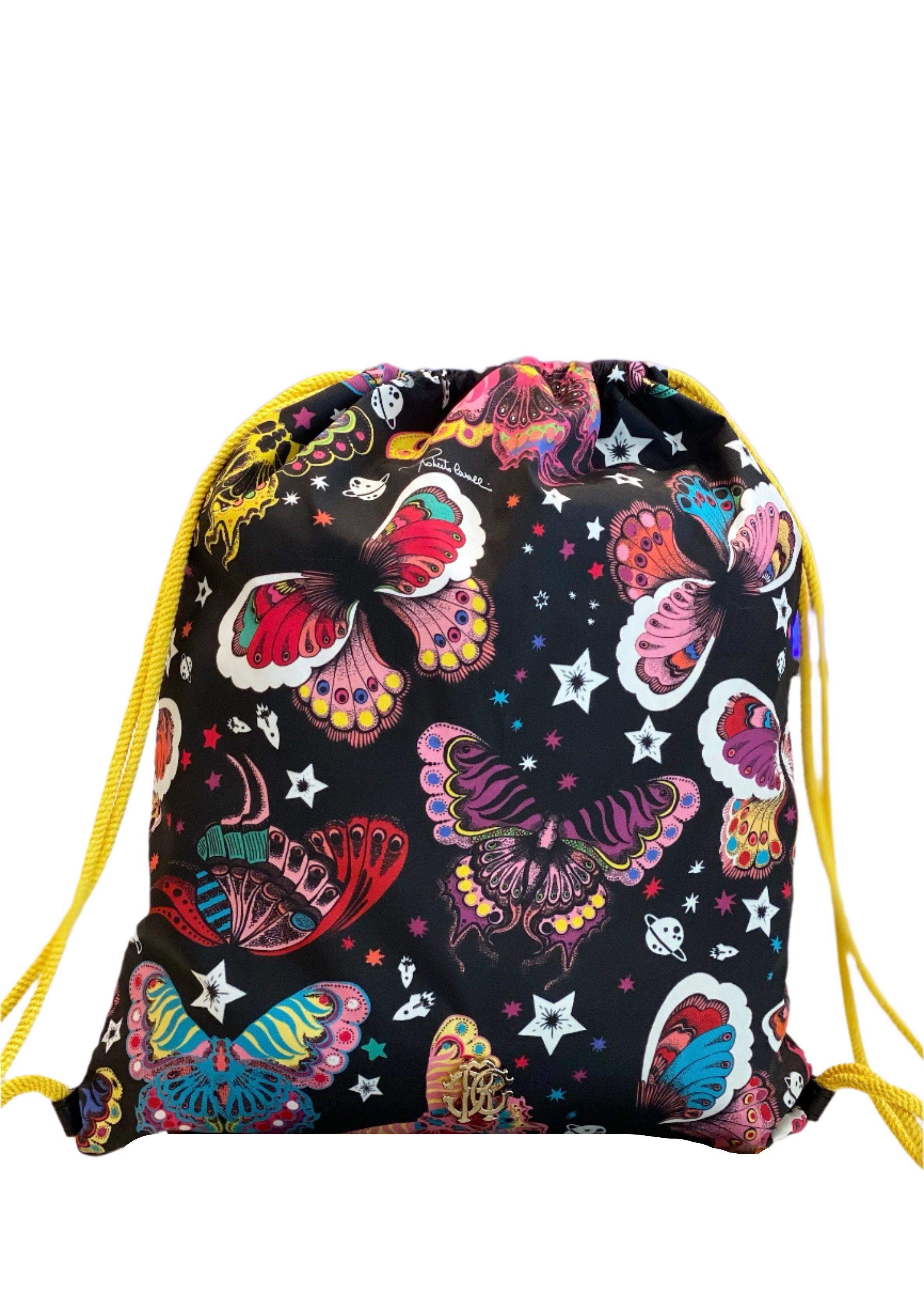 Chic girl's backpack. Designed with butterfly print all over. Drawstring strap. Finished with 'RC' emblem in silver.