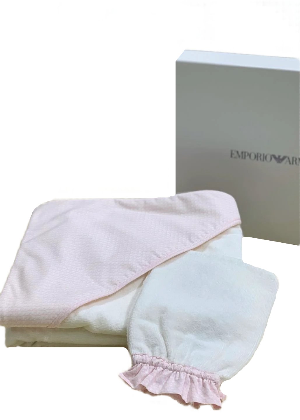 Cotton soft absorbent infant towel with gloves. Both towel and glove are designed with an eagle pattern print. Ideal for gift.