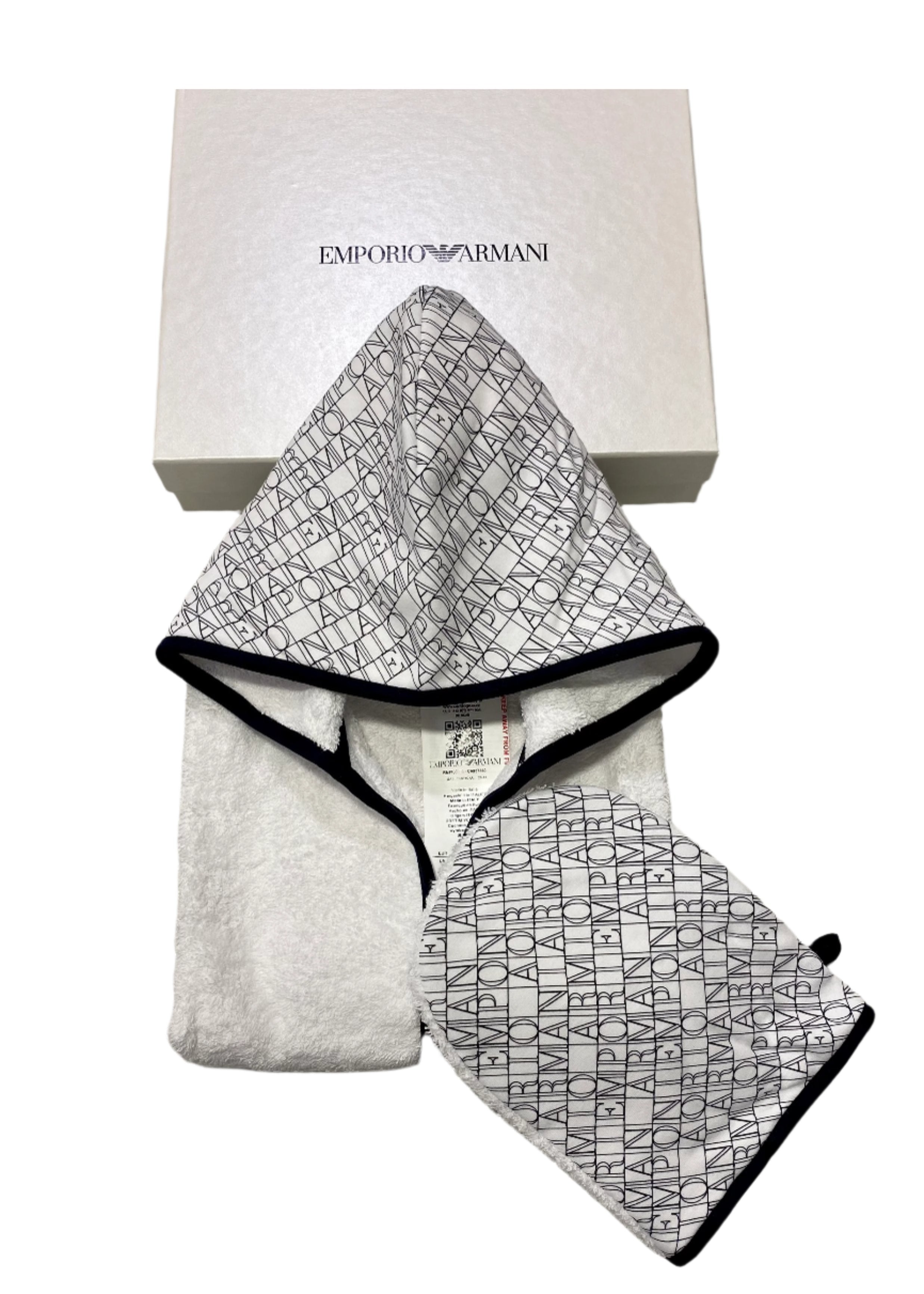 Cotton soft bathrobe and glove set. Both are all over printed with 'EMPORIO ARMANI' lettering. Ideal gift for newborn baby.
