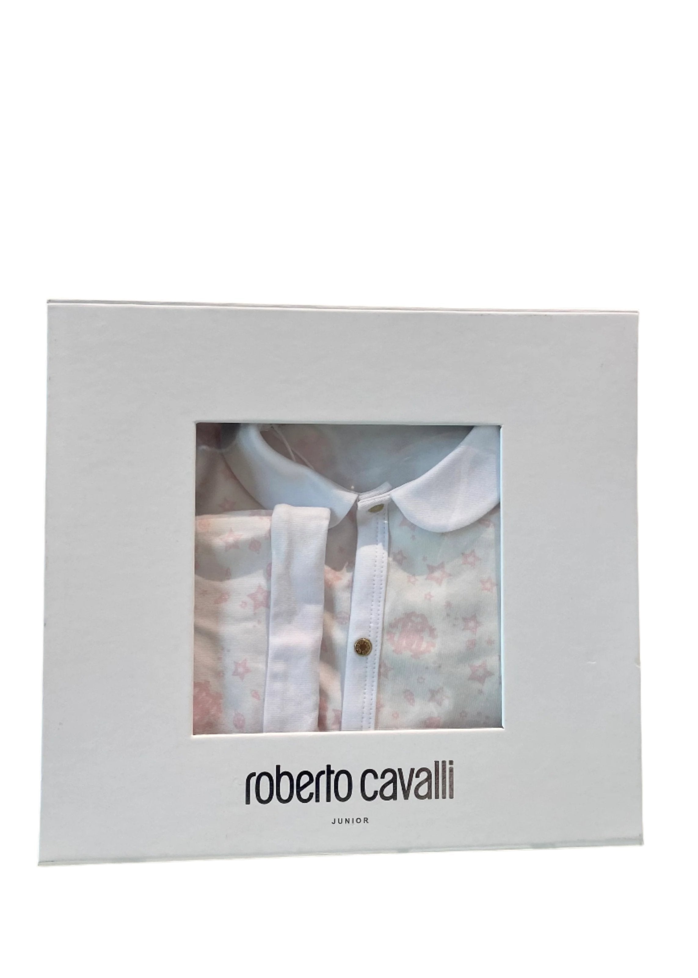 A lovely baby girl gift set from Roberto Cavalli. This gift set includes overall and a hat, both are all over printed with cute stars and RC logo. Overall has button snap opening on the front and in between legs.