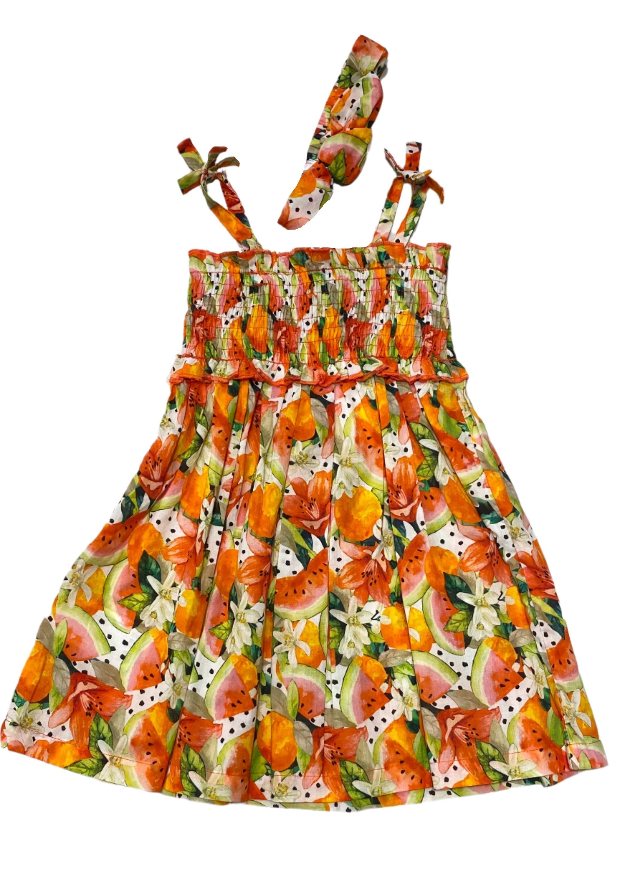 Adorable, soft, casual girl dress. All over printed with watermelon and its flower. Elasticated on the chest, has a spaghetti strap, finished with a matching headband.