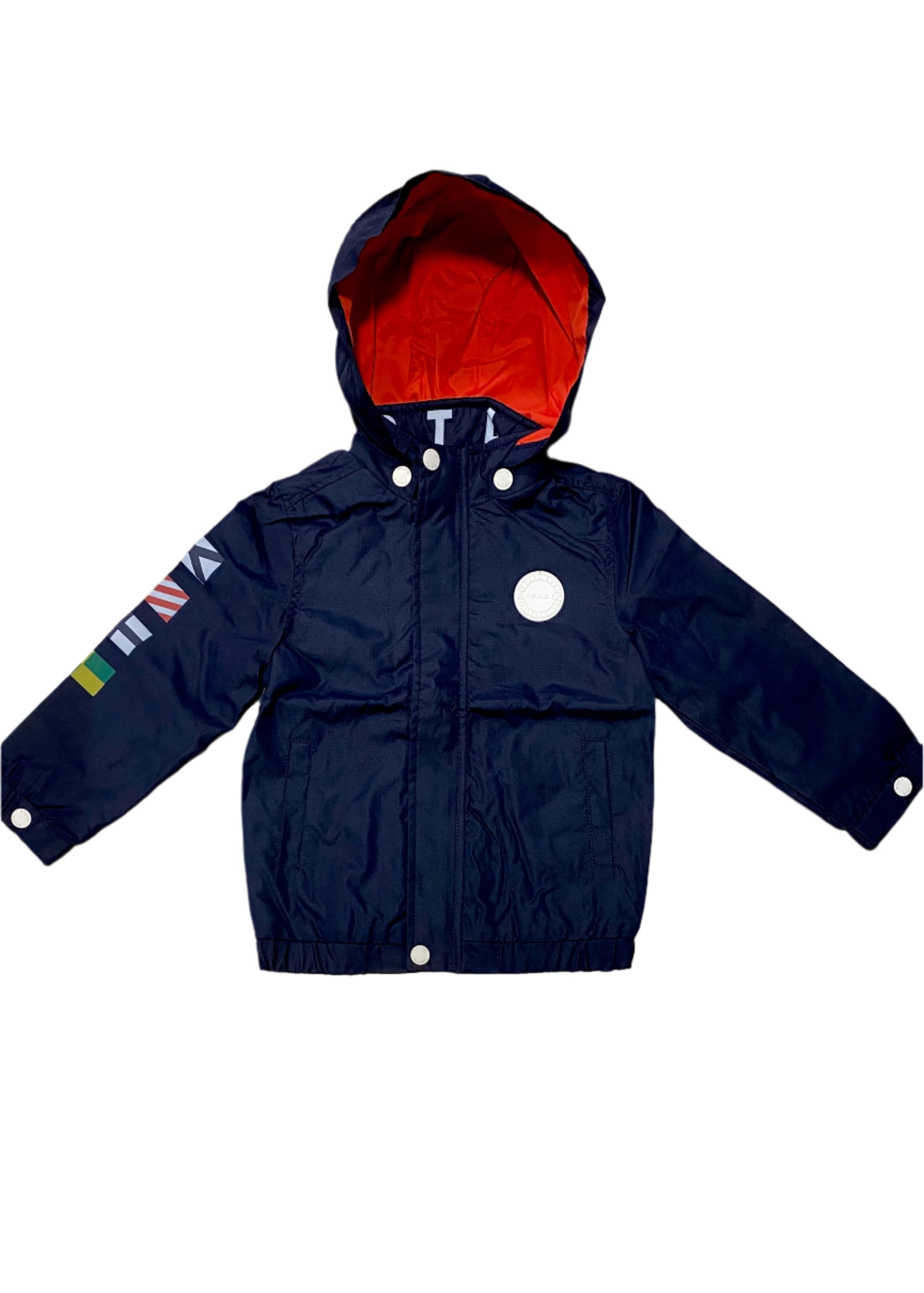 Snuggled up in style with this cool boy's hooded jacket. It has concealed zip fastening on the front with snap button. It is designed with auto racing flags on one arm. Has two pockets and inside has colorful stripe design with 'CAPTAIN' writing.