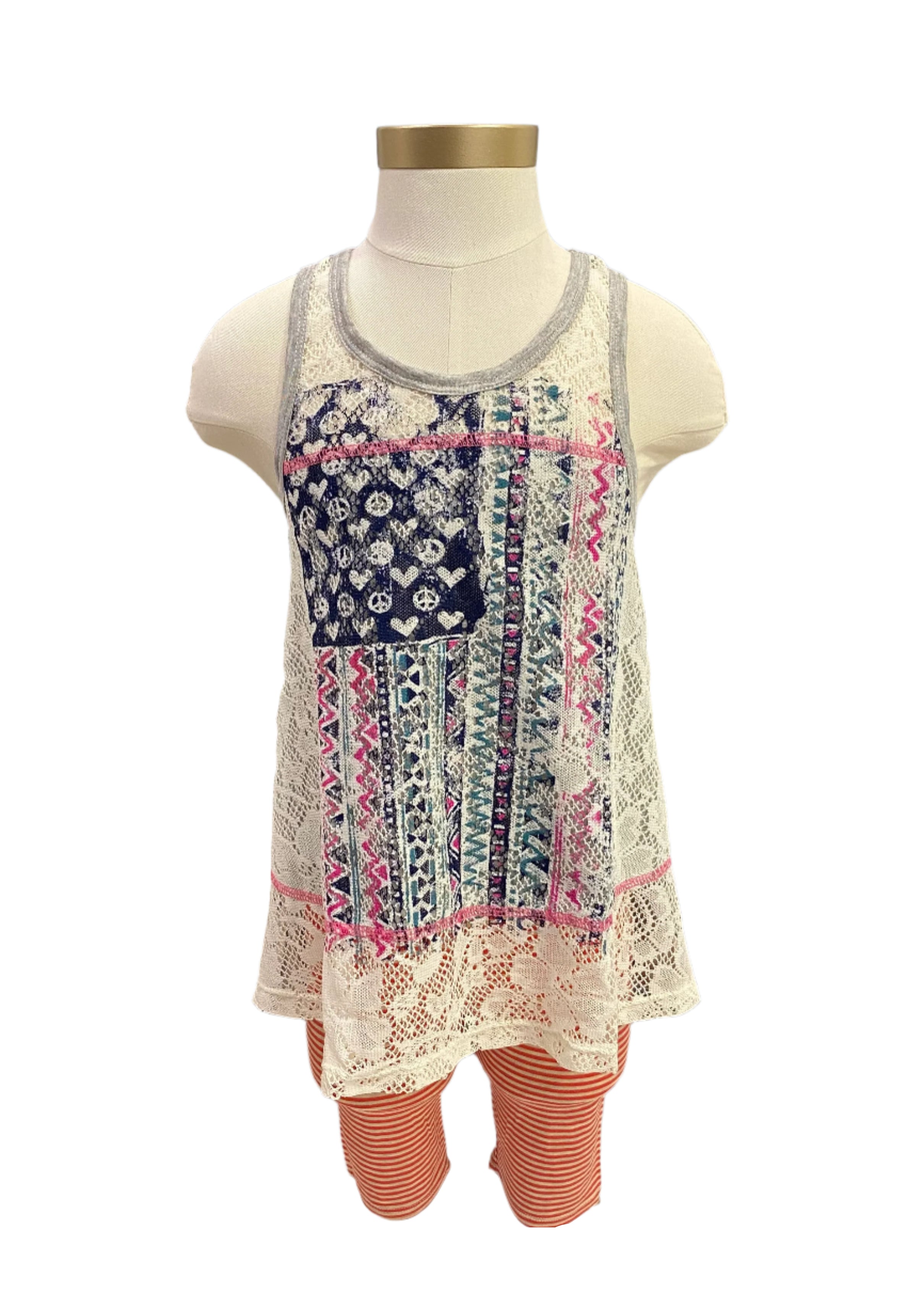 This racerback flare-type top is matched with beige orange stripe legging. Made in USA by SARA SARA.