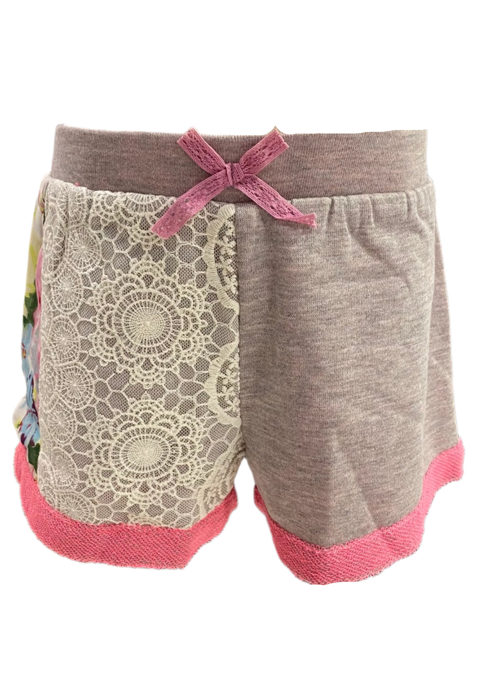 This lovely short is designed with lace ribbon on garterized waist. It has white embroidery on one side, pink lining at the back which gives a pocket like look. Pink colored fabric inside. Designed in USA by SARA SARA.