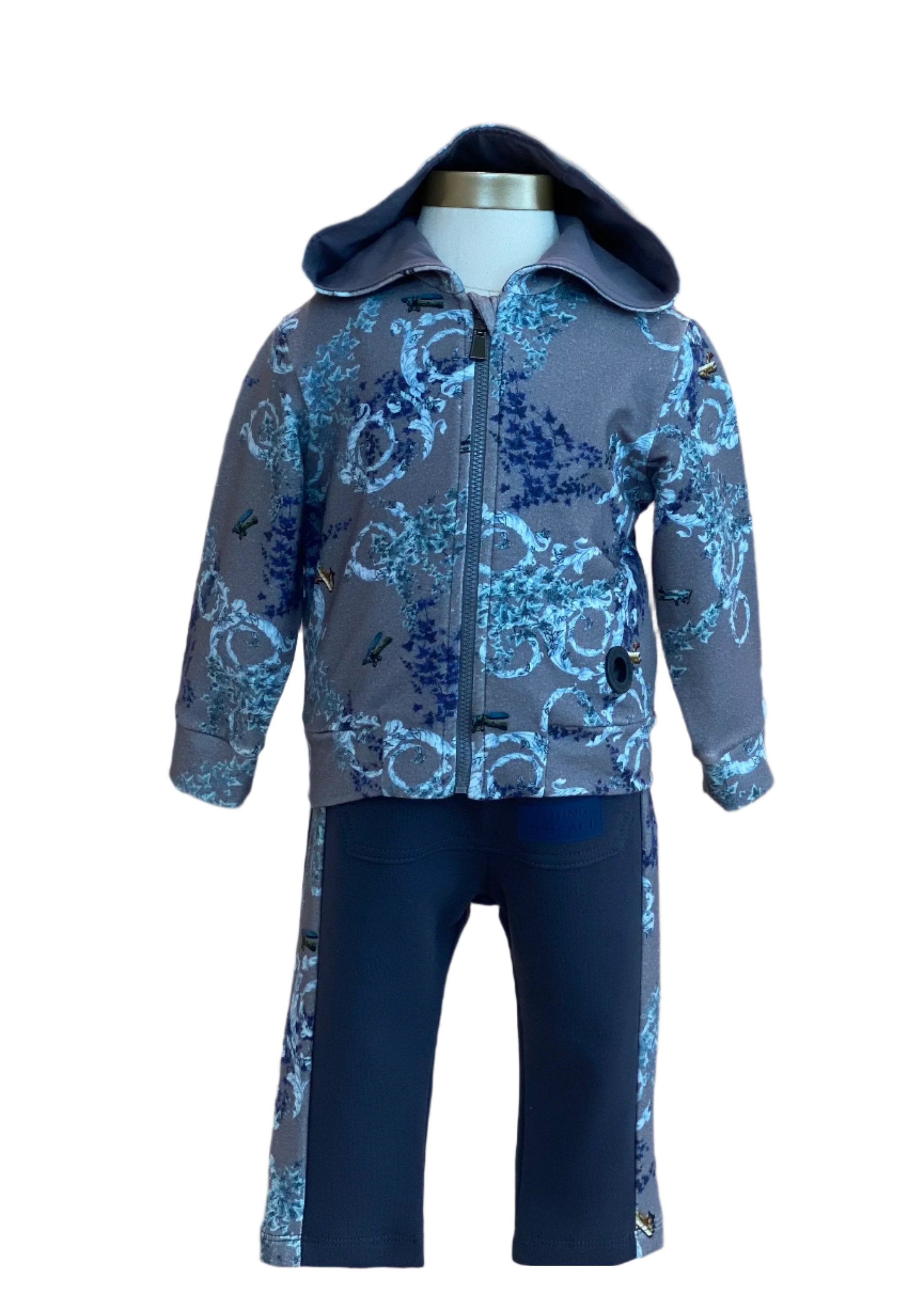 Hooded sweatshirt designed with baroque style and airplane prints. Zip fastening. Brand logo patched above hem. The matching trouser is designed with frenzy baroque pattern. A pocket in front patched with rubberized brand name Young Versace, elasticated on the waist.