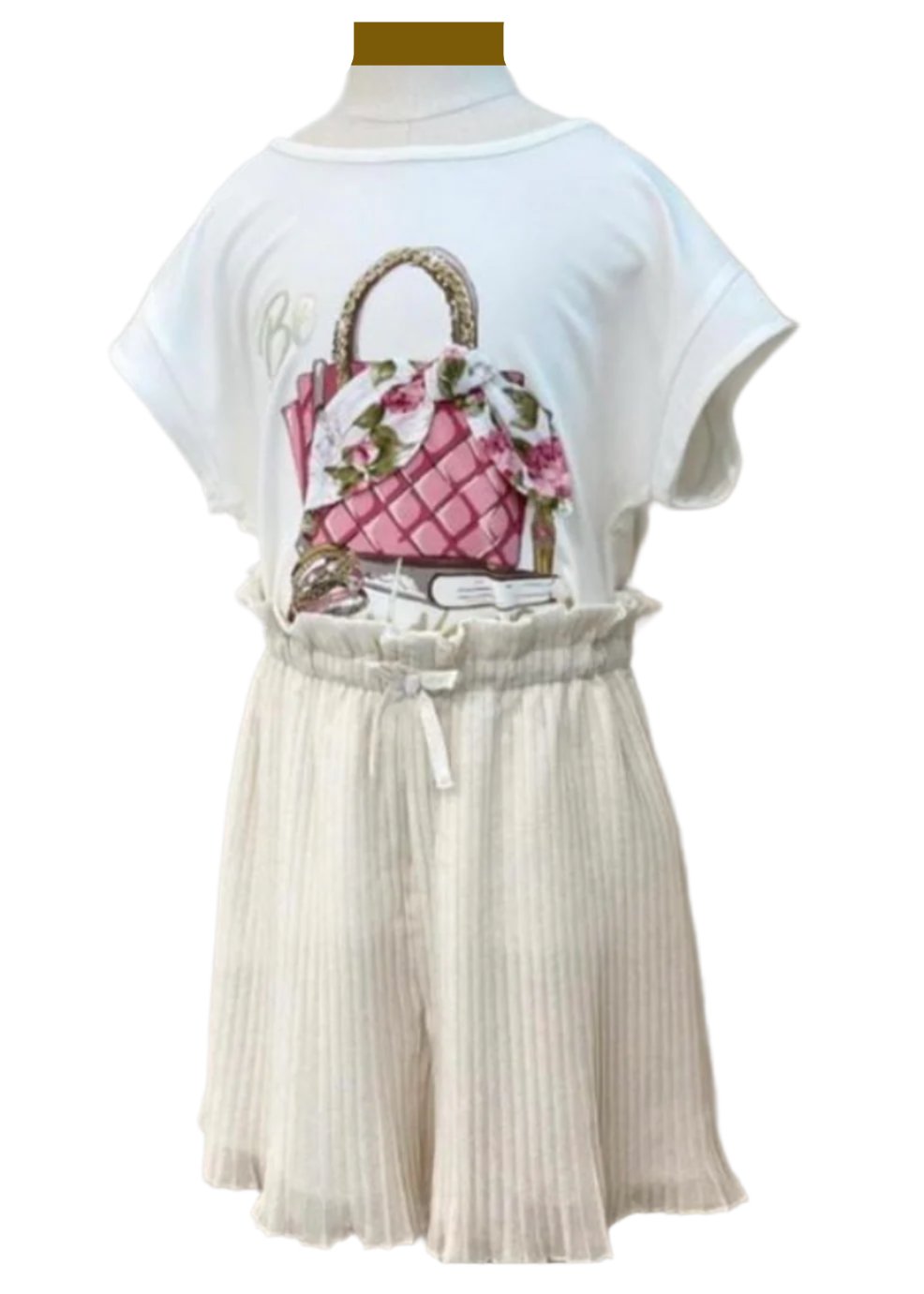 Blouse with soft, stretchy jersey fabric. Short sleeve with bag print and floral ribbon design with flowers printed on the chest. Pleated soft shorts has elasticated waistband with ribbon.