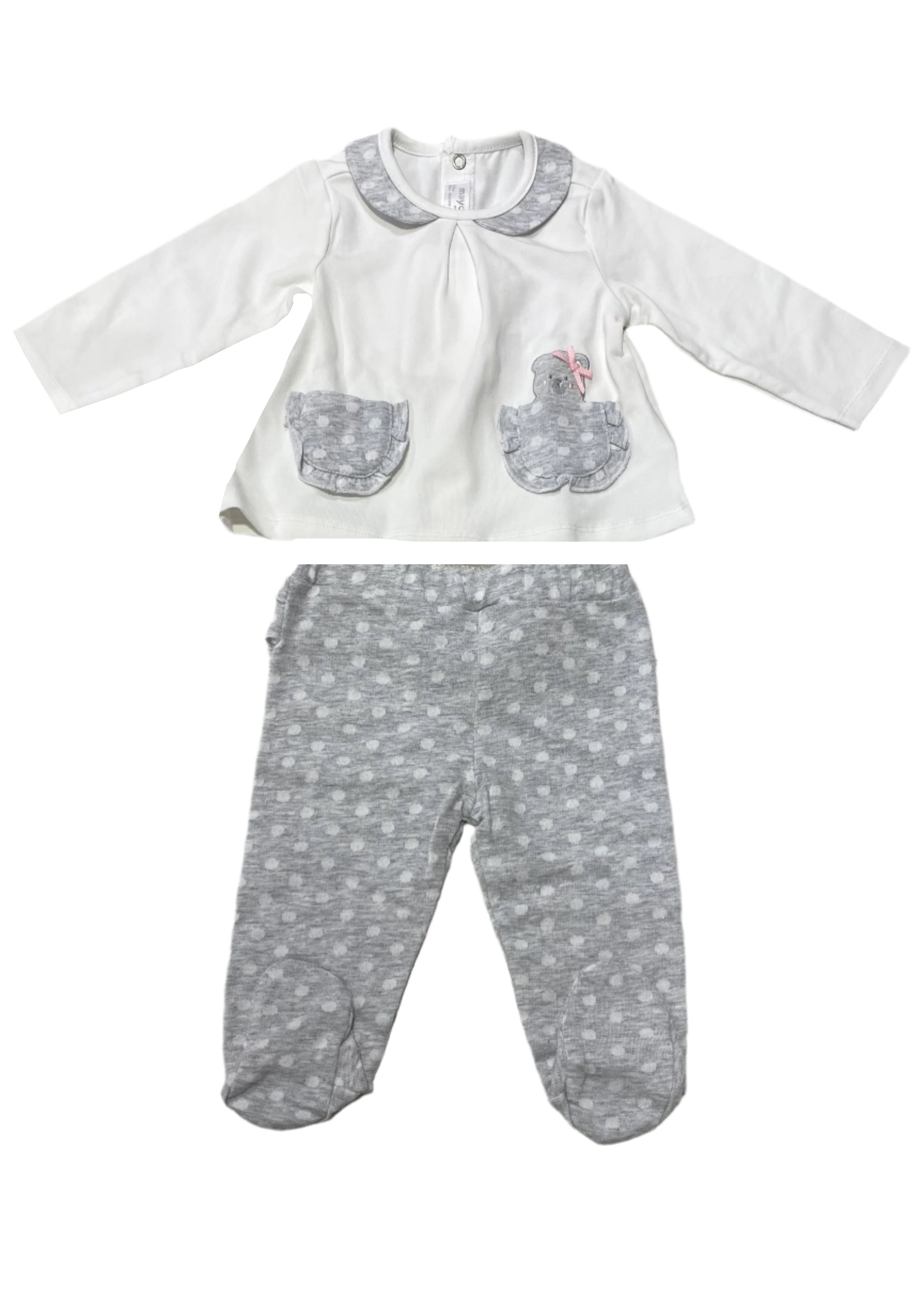 Lovely 2pc baby outfit. Long sleeve top, polka designed collar, with pockets and bear embroidery, snap button closure at the back. The top comes with matching pants all over print with polka and has ruffle at the back This outfit comes with a box which is ideal for gifting.