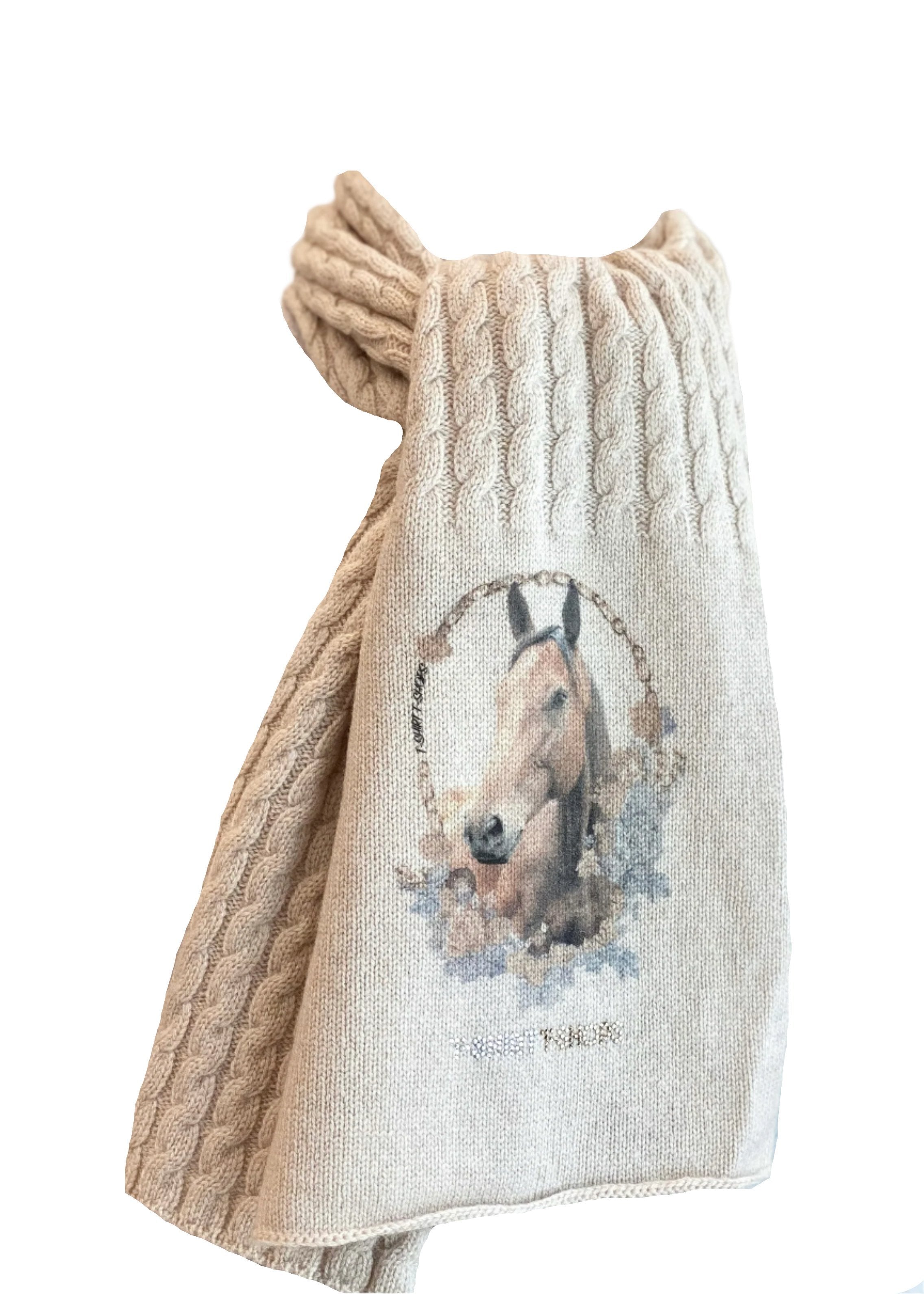 Protect your child against cold with this 100% cashmere made scarf. Designed with a blaze horse print in a floral frame. Finished with a 'T-SHIRT T-SHOPS' writing in Swarovski crystals.
