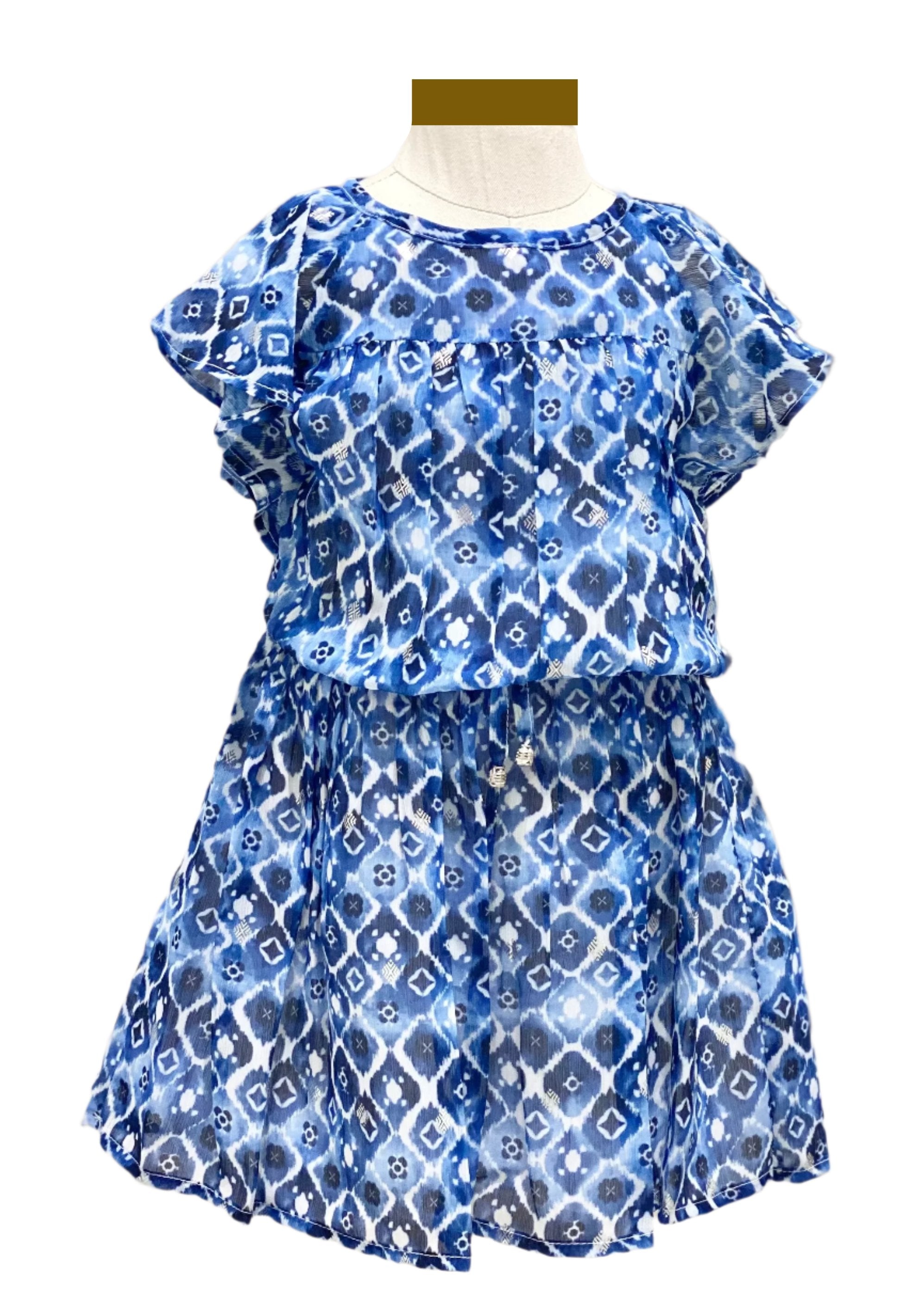 Cute, charming chiffon dress. Elasticated on the waist with ribbon and has ruffle sleeves. Zip fastening at the back.