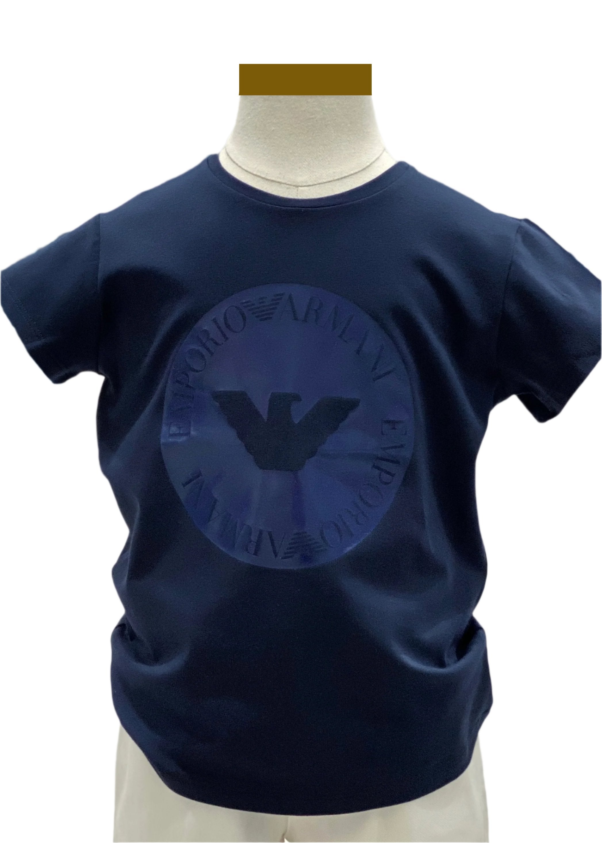 Made from soft cotton jersey. T-shirt has round 'Emporio Armani' eagle logo printed on the front. It has short sleeves and a narrow ribbing in the neck opening.