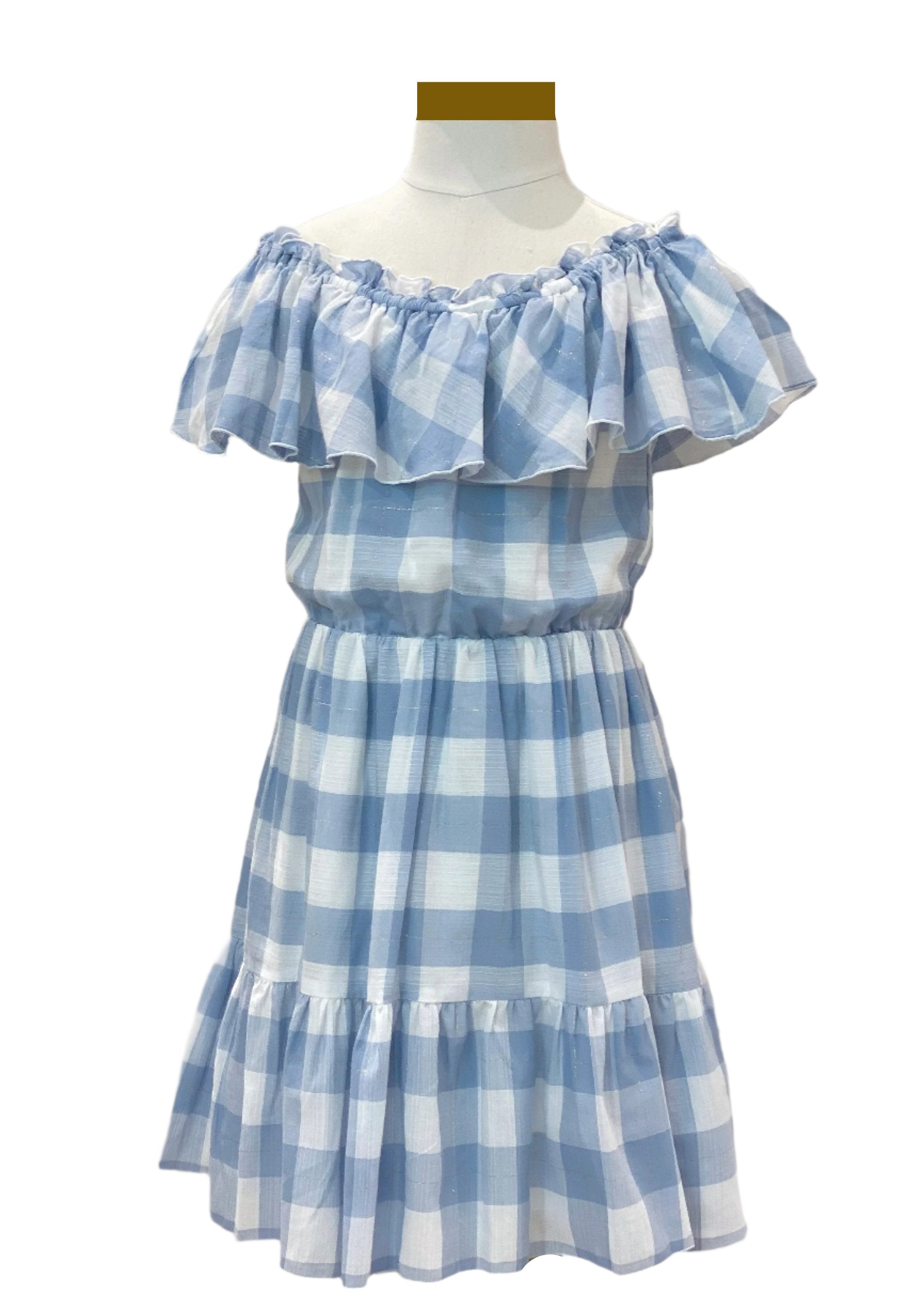 Pretty blue squares ruffle dress. It is made in beautifully soft and lightweight poplin with a shirred back panel allowing it to slip easily over the head. A classic style, it has ruffle elasticated neckline and sleeves.