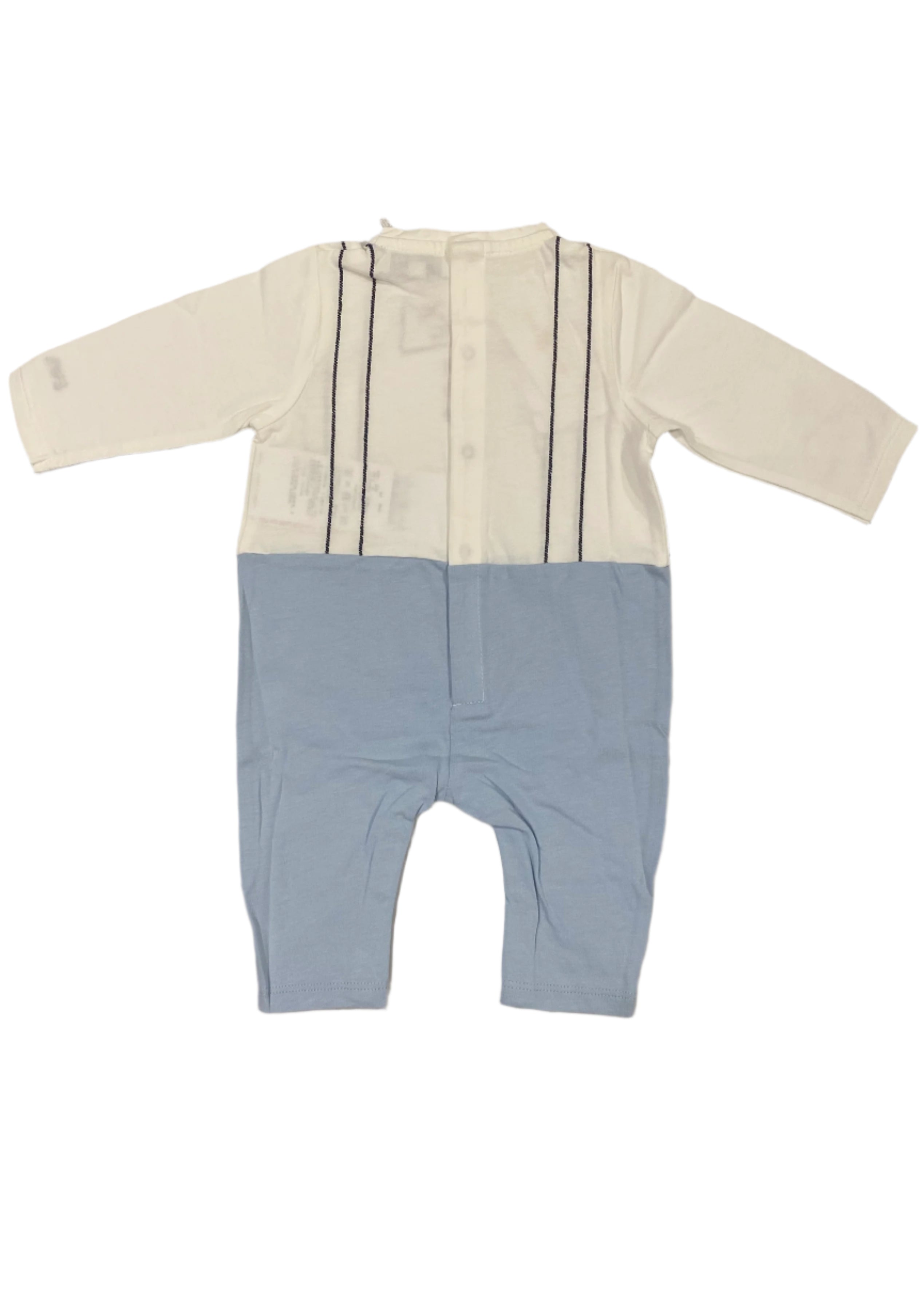 A suit-like designed romper. It is embroidered with a bow tie a, eagle logo button and suspender. Smart casual baby romper.