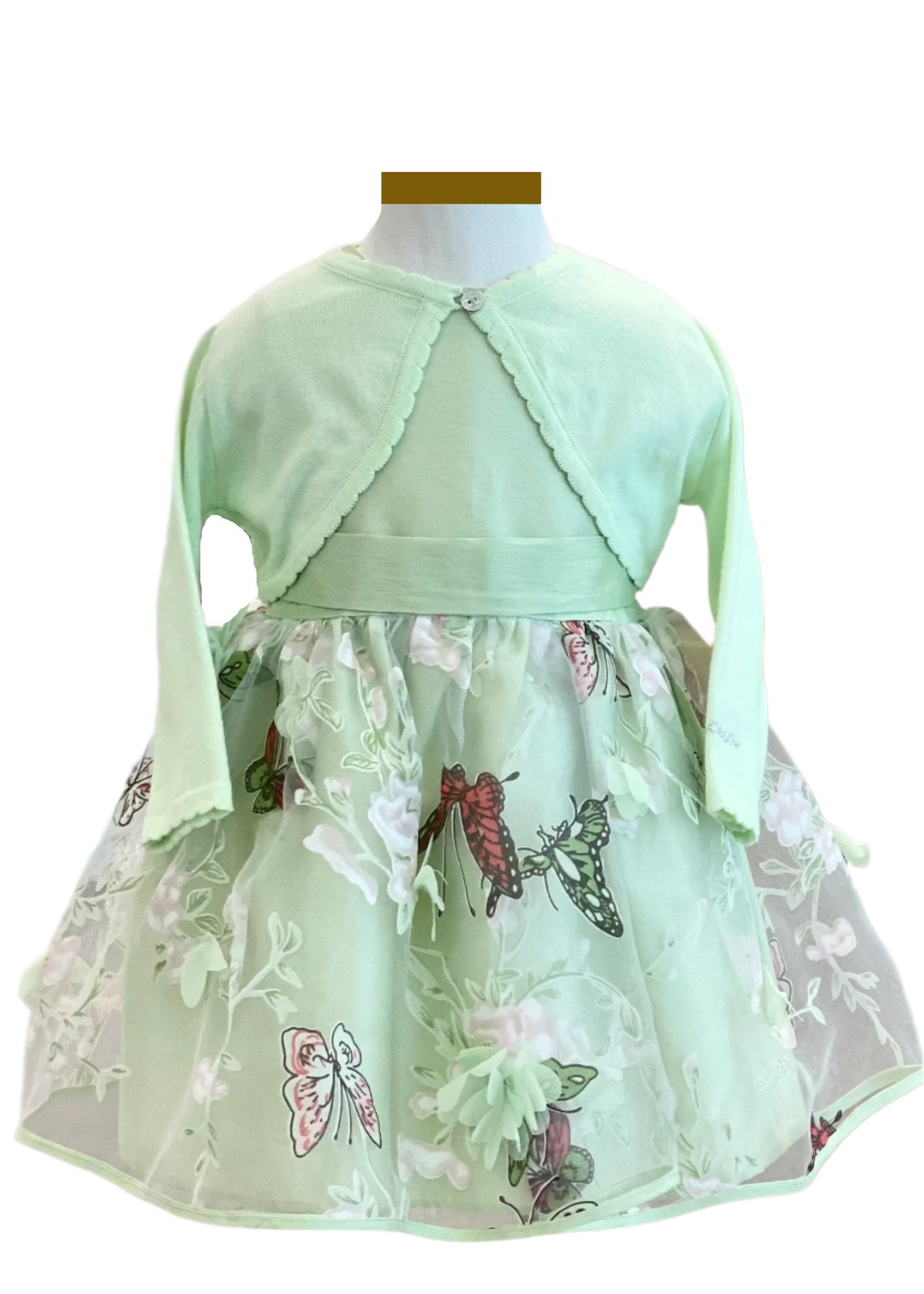 Lovely dress for your baby girl. Dress has soft silk fabric on chest with belt, tulle skirt is designed with butterfly pattern print. Zip fastening at the back. Baby sizes come with a matching cardigan.