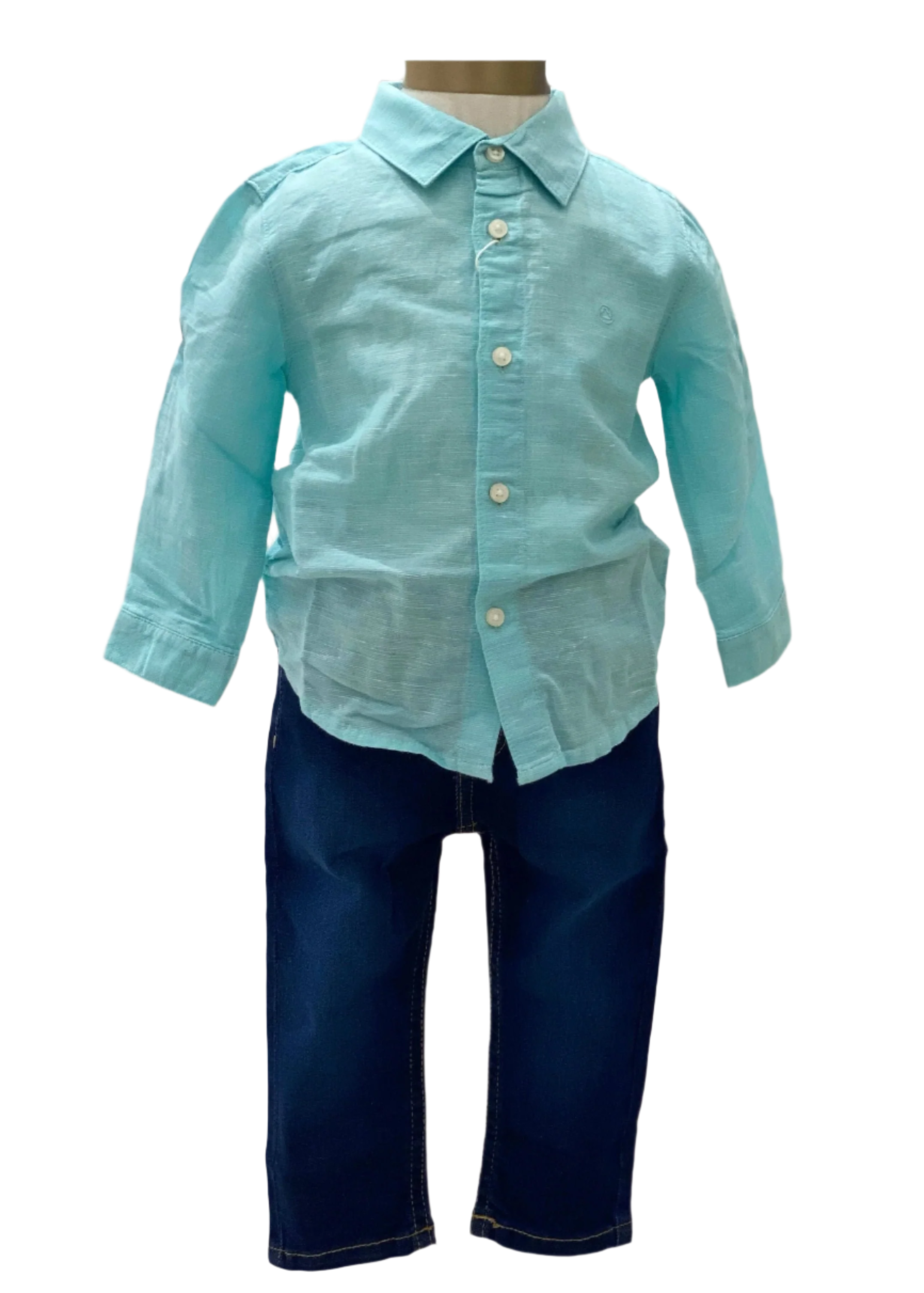 A smart casual outfit for your baby boy. This set comes with a long sleeve shirt and a stretchable denim pants with five pockets.