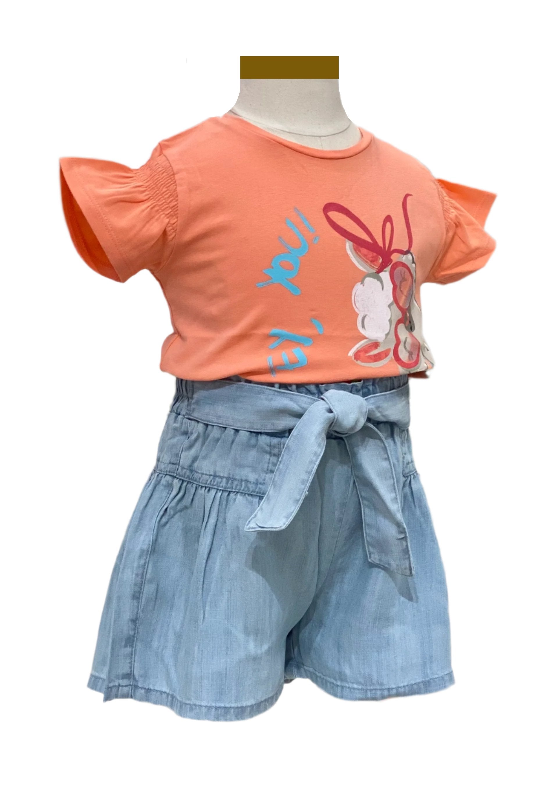 Adorable girl's outfit. This comes with a short sleeve that has smocking details on it, this top is designed with camel print enhanced with tassel and knot applique. The top is matched with soft, flowy short that is elasticated on the waist with attached belt for ribbon.