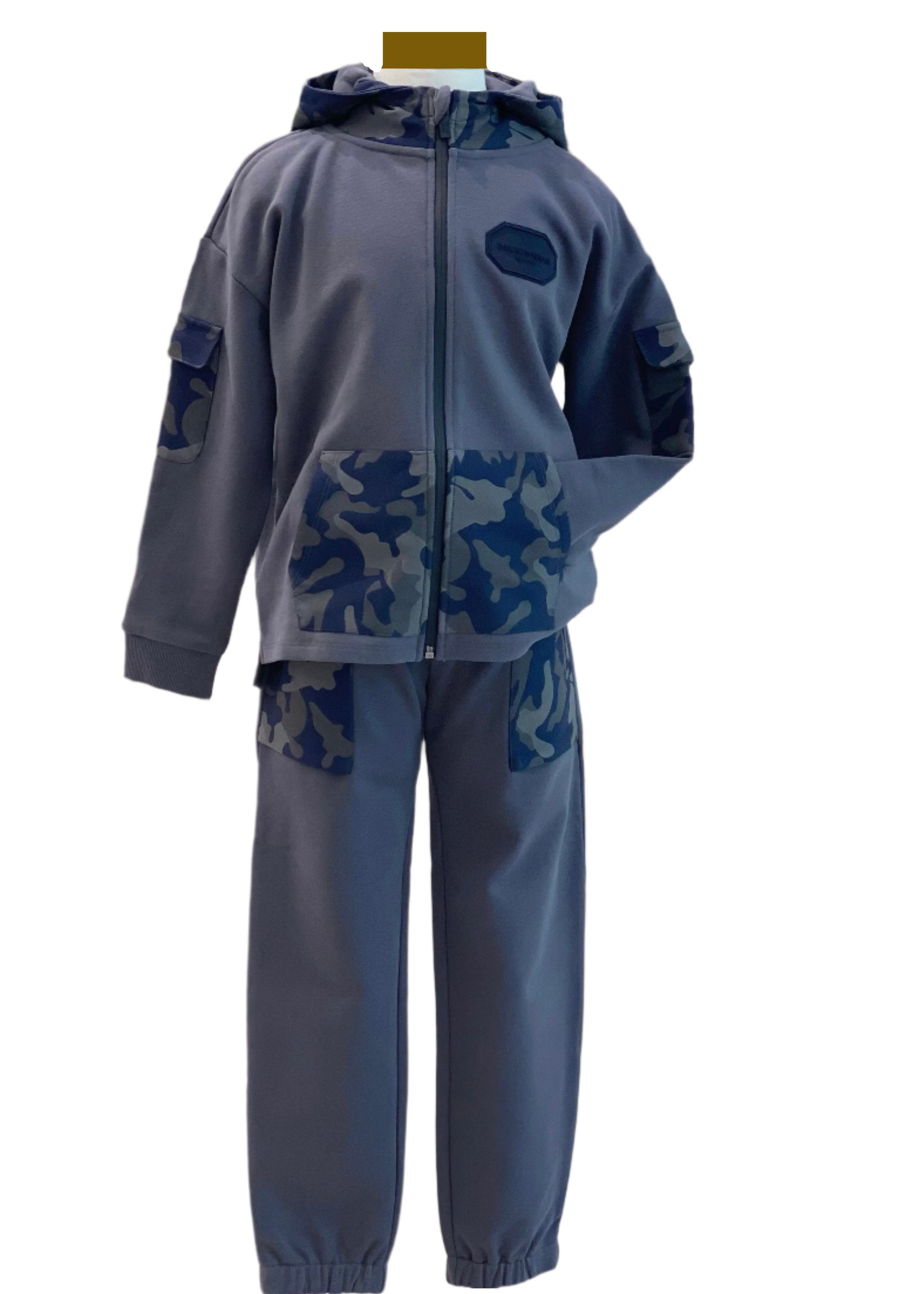Tracksuit set designed with a smart camouflage pattern in two shades of gray and navy in a smooth woven quality. Jacket is zip fastening rubber closure and with hood. A rubber label with the 'Emporio Armani' on the chest. With a smart flap pocket and two front pockets. Pants has an elasticated waistband with two rubber closure for front large pockets, with wide elastic edges and at the back is a black rubber brand 'Emporio Armani'.