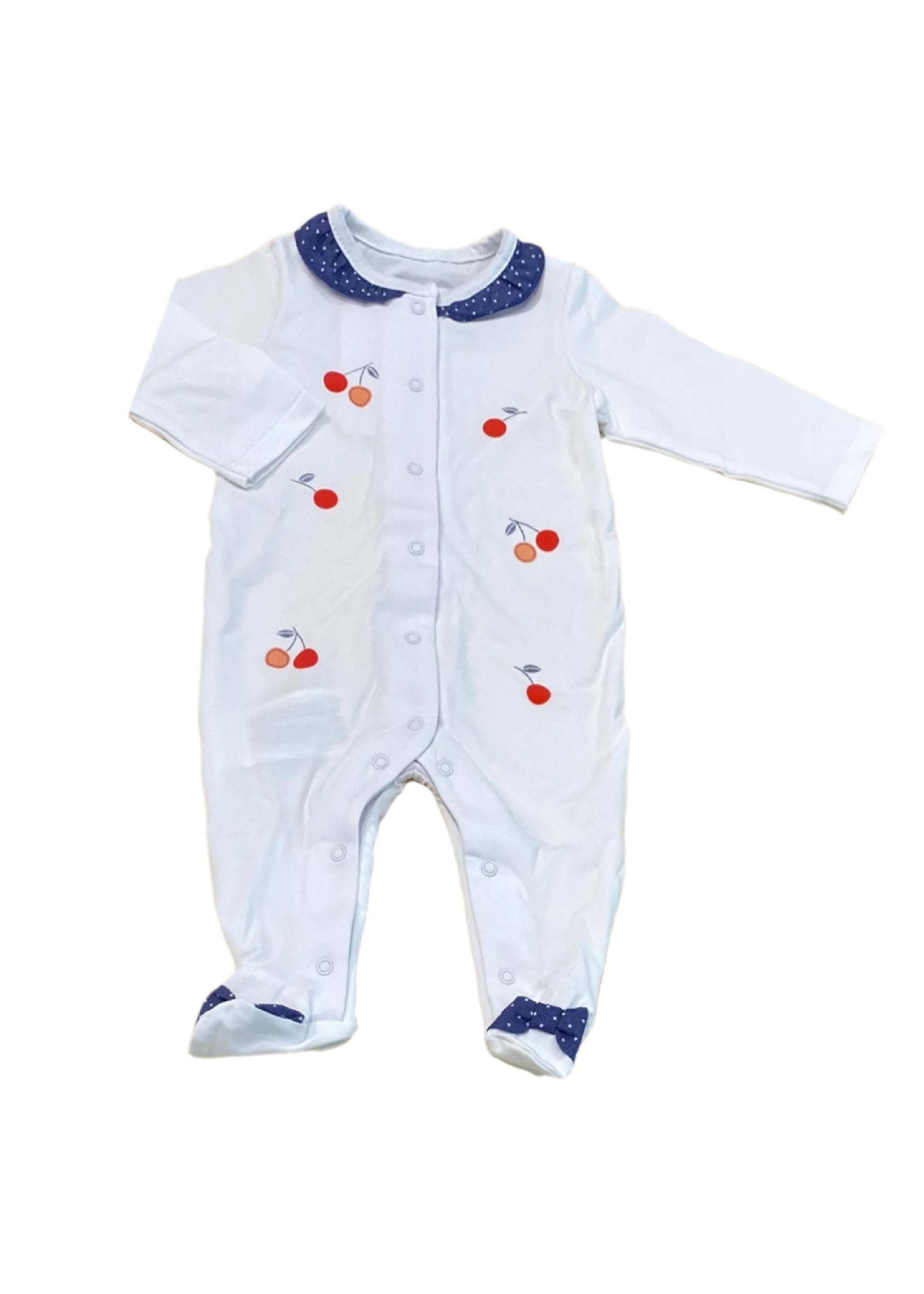 Beautiful baby girl romper. Embroidered cherry design with polka dots detail on the collar and feet. Snap button fastening on the front and in between legs. This romper comes in a box which is ideal for gifting.