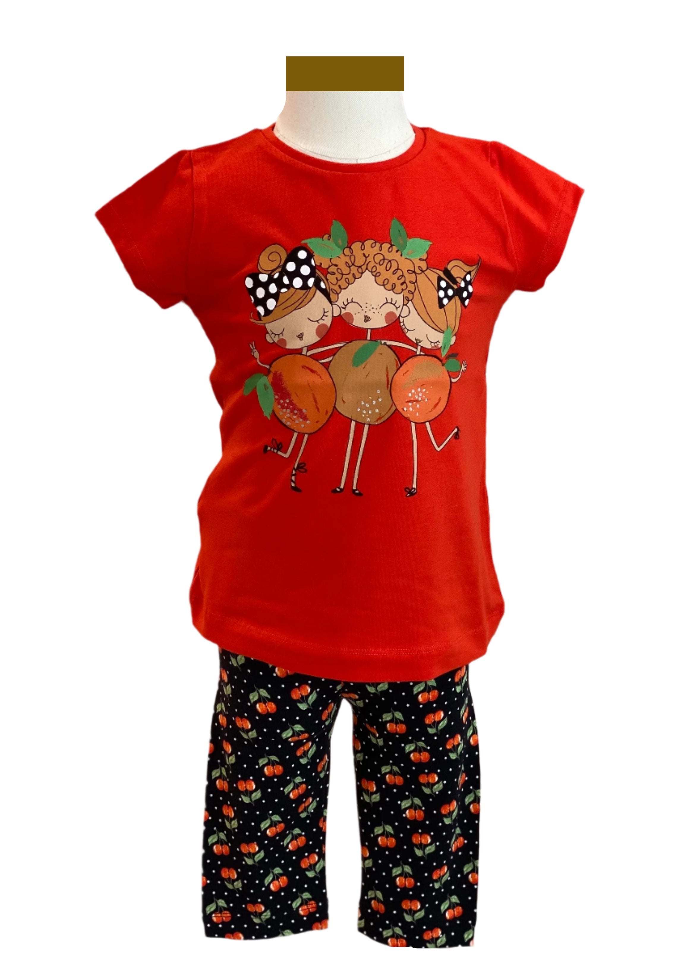 Comfortable top and legging outfit set. This set comes with a short sleeve, soft t-shirt printed with lovely cherry ladies. The top is matched with a stretchy quarter legging, all over printed with polka dots and cherry design.