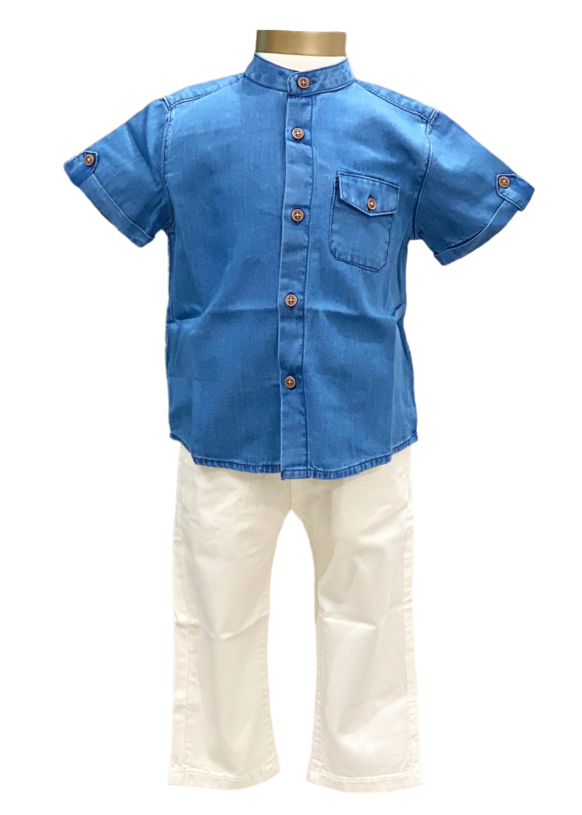 This set comes with a Chinese collar button down shirt with pocket and chino pants. A perfect casual outfit for your baby boy.