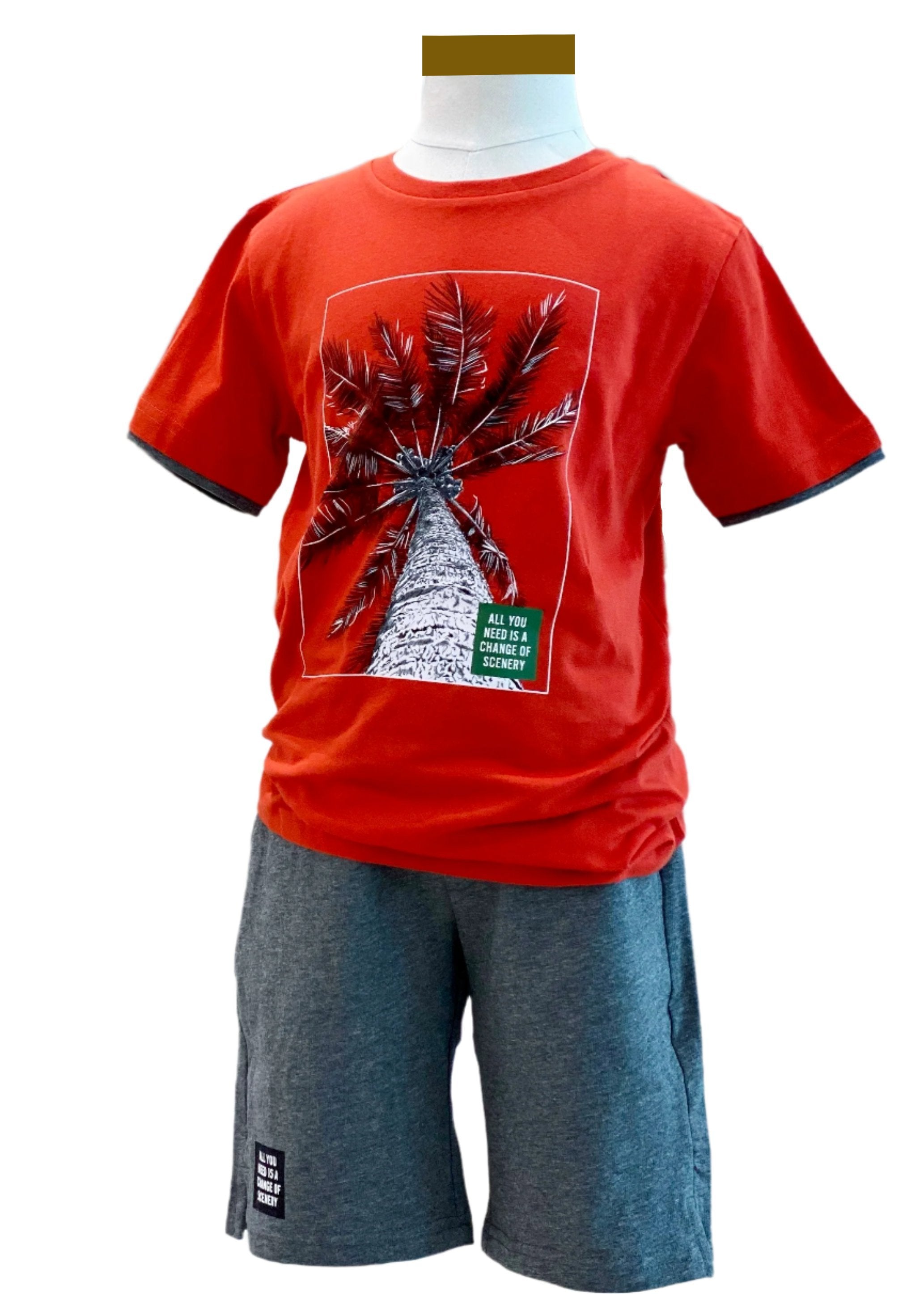 Red T-shirt with coconut print on the chest and back. Sleeves trimmed with gray knitwear. Gray knitted shorts with side pockets. Slits in the side seams at the bottom. Elasticated waistband with drawstring for adjustment.
