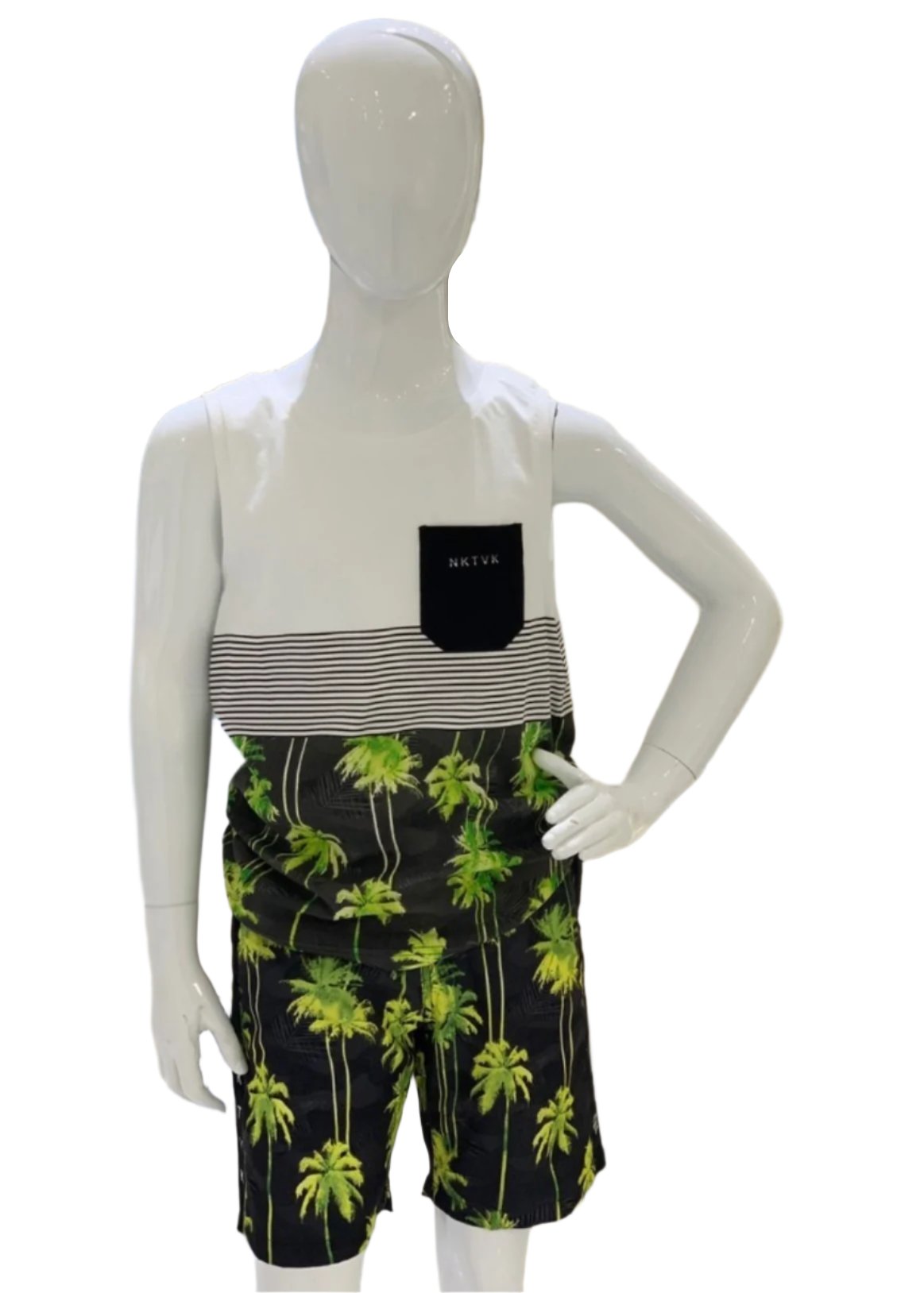 It is made of soft cotton. Sleeveless shirt and swimming short has 'Coconut Tree' design and is made of polyester and has drawstring with one back pocket.