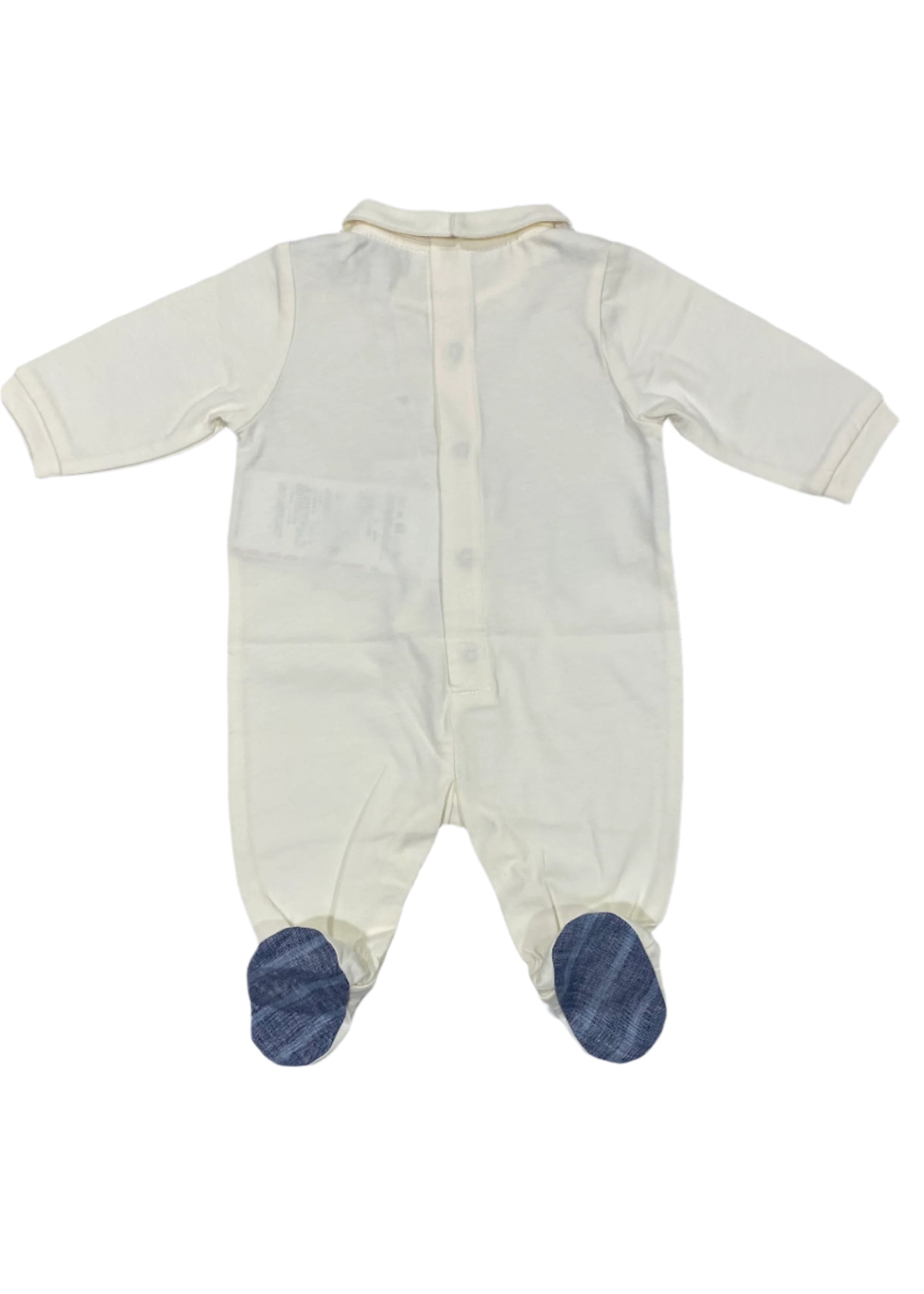 Made of natural cotton and linen. Collared blue vest and bow tie design romper. Bodysuit with long sleeves, turn-down collar and fastener on the back. Comfortable to wear.