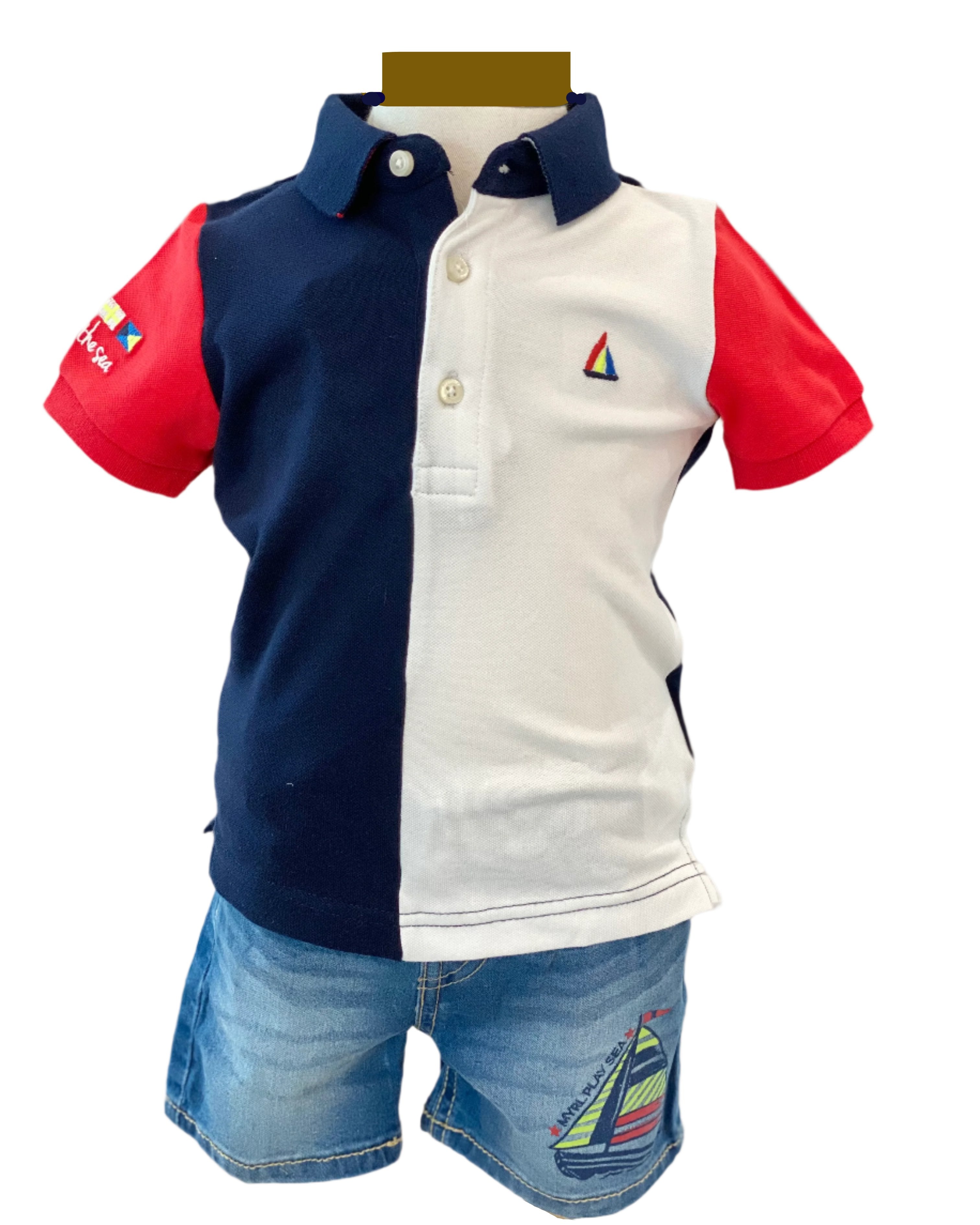 A casual outfit set for baby boy. This set comes with a shirt in color block design, with sailboat embroidery on left chest. Matched with five pocket denim short design with sailboat print.