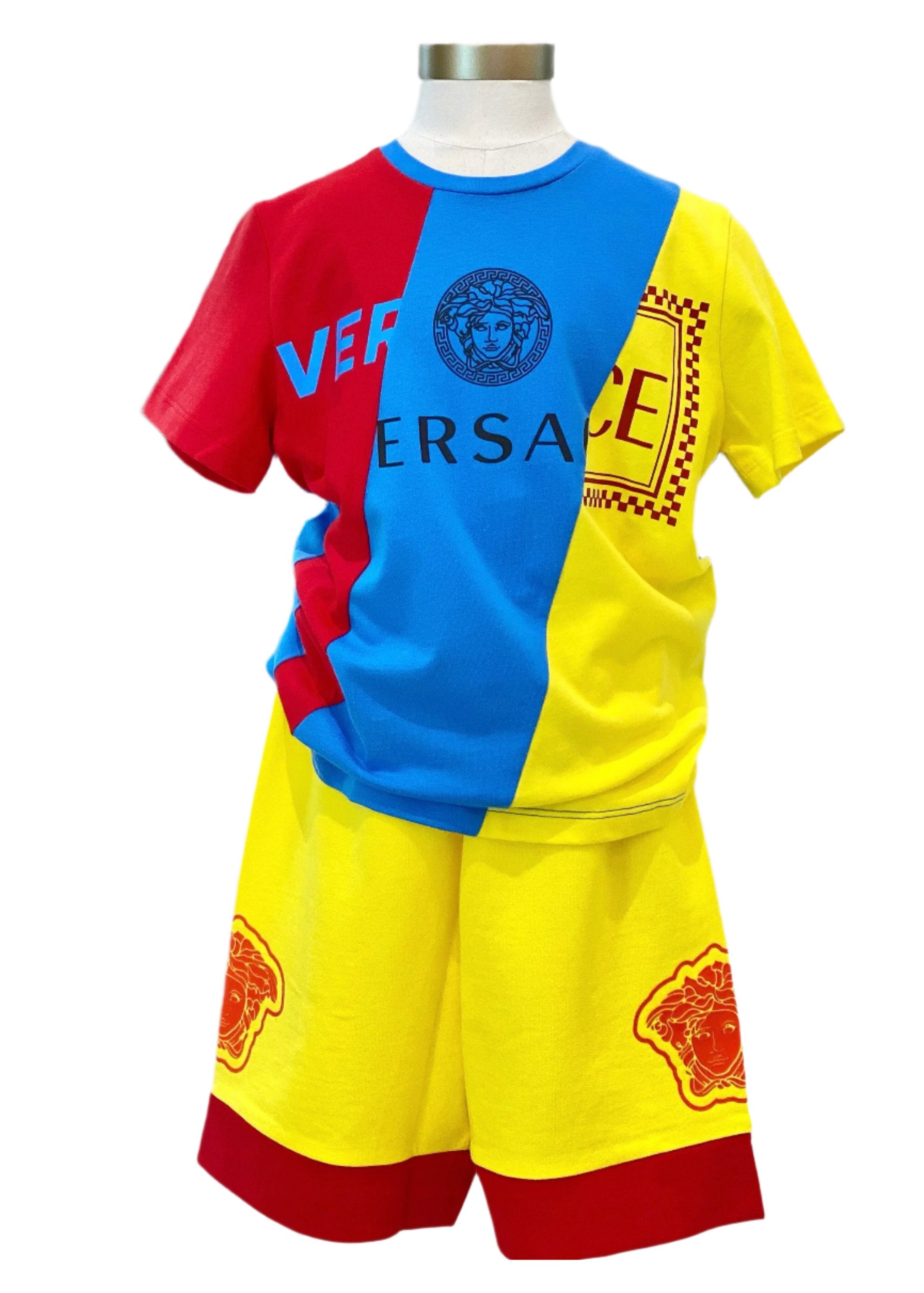 Comfy, casual boy's top and short set. Top has block color design with 'VERSACE writing, round neck, short sleeves. This top comes with a matching soft short designed with medusa logo on both sides.