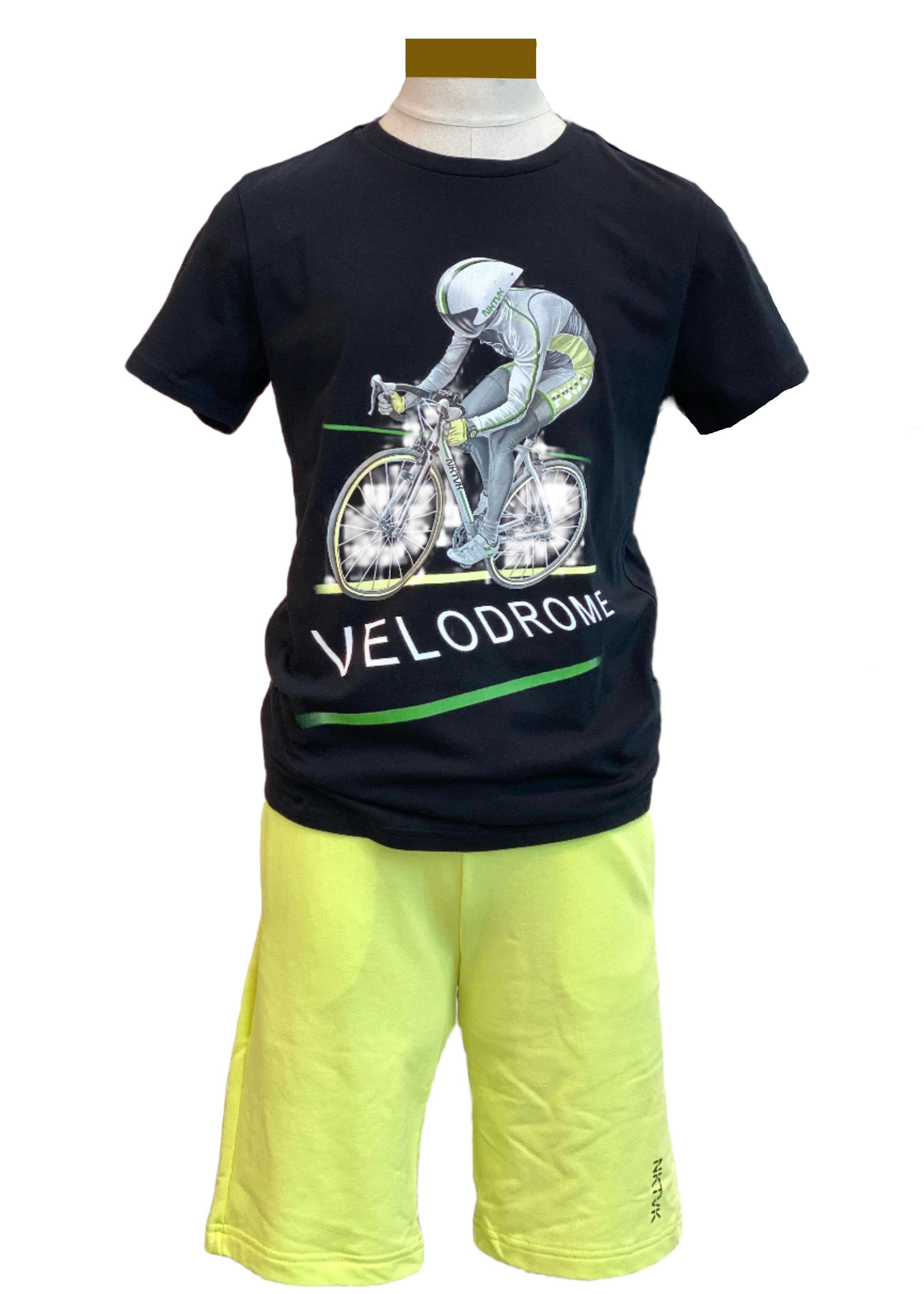 Made of soft cotton. Has a classic cut with short sleeves and narrow ribbing at the neckline with 'Cycling'design on the chest. Shorts has elasticated waistband with drawstring and two side pockets and one back pocket.