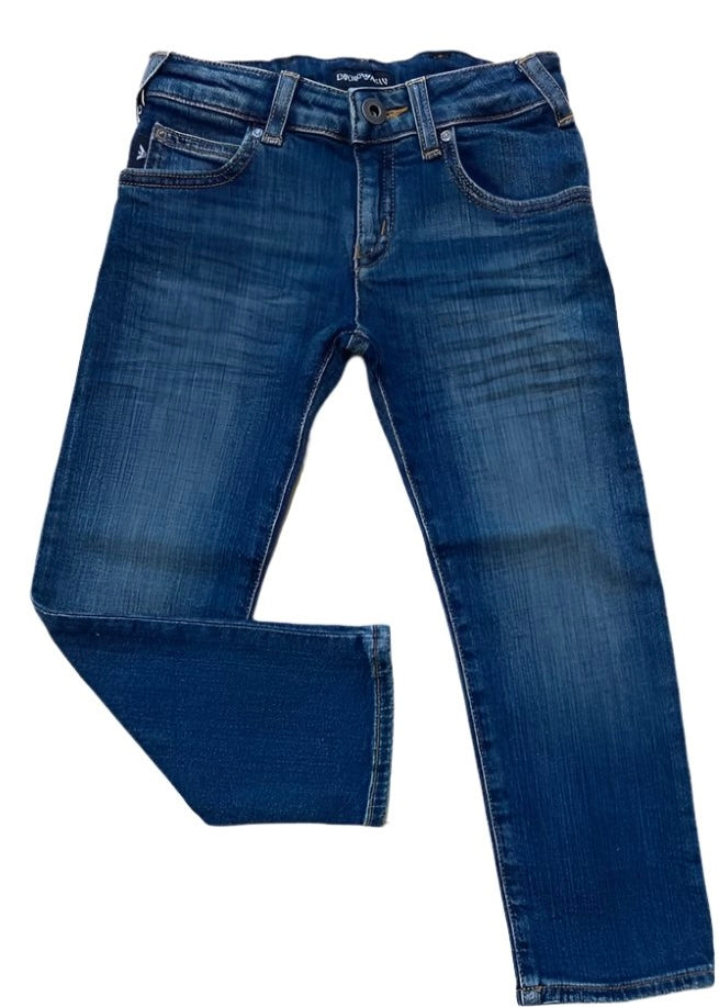 Blue denim jeans for boys. Made from soft cotton fabric, they have five pockets styling with metal 'GA' eagle logo on the back right pocket. Fasten with a debossed logo button and zip, have belt loops and an adjustable waistband to ensure a perfect fit.