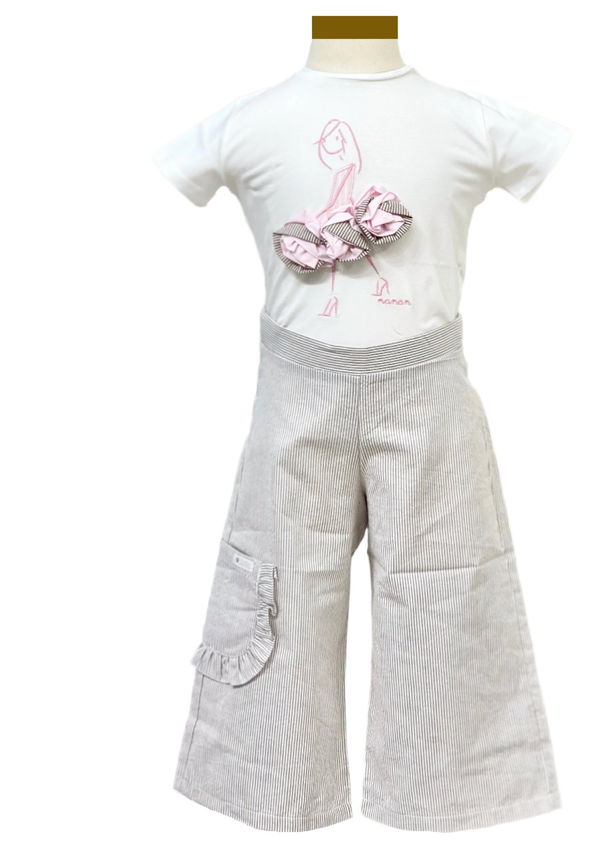 Fashionable outfit set for baby girl. This set comes with a top design with doll embroidery applique and stripe square pants with pocket on one side.