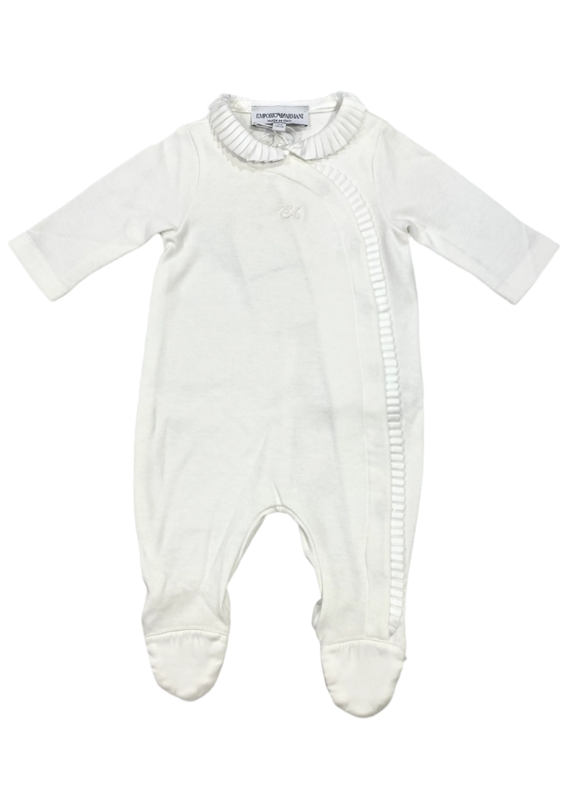 Adorable baby girl romper. Button snap fastening on sideways, designed with 'EA' embroidery and pleat trim detail.