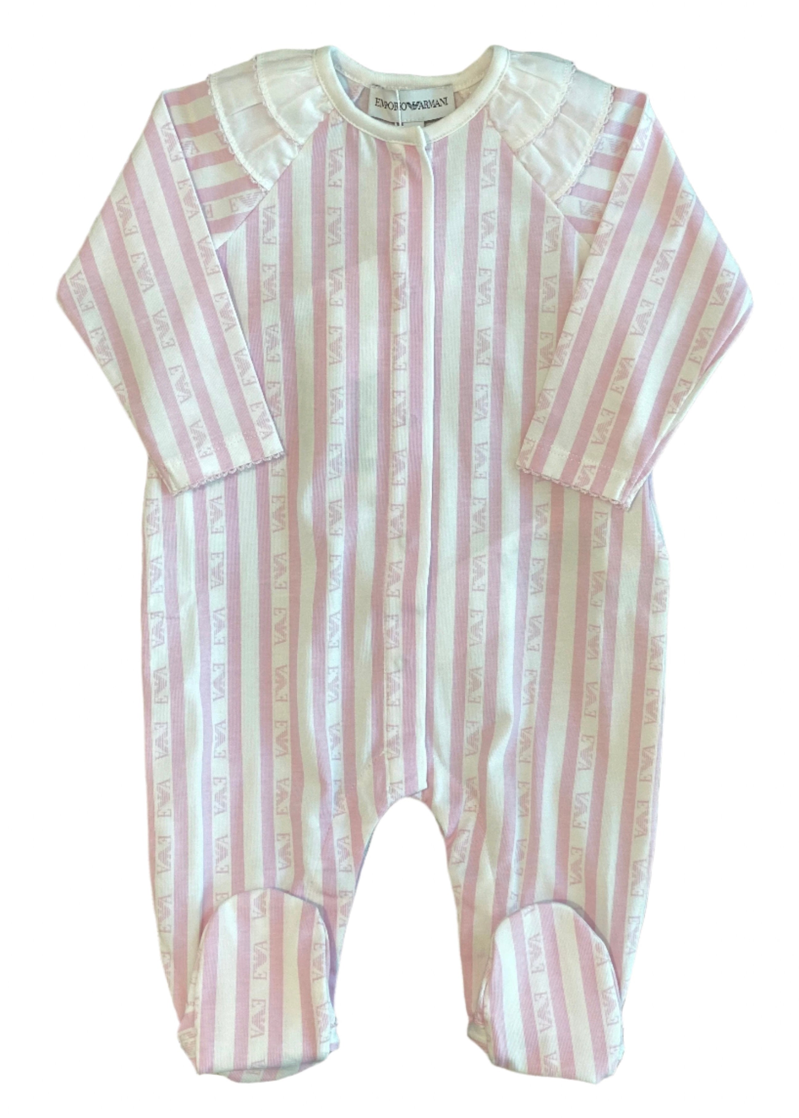 Pretty baby girl romper in stripe design with 'EA' prints. Finished with pleat details on both shoulders. Snap button fastening on the front and in between legs.