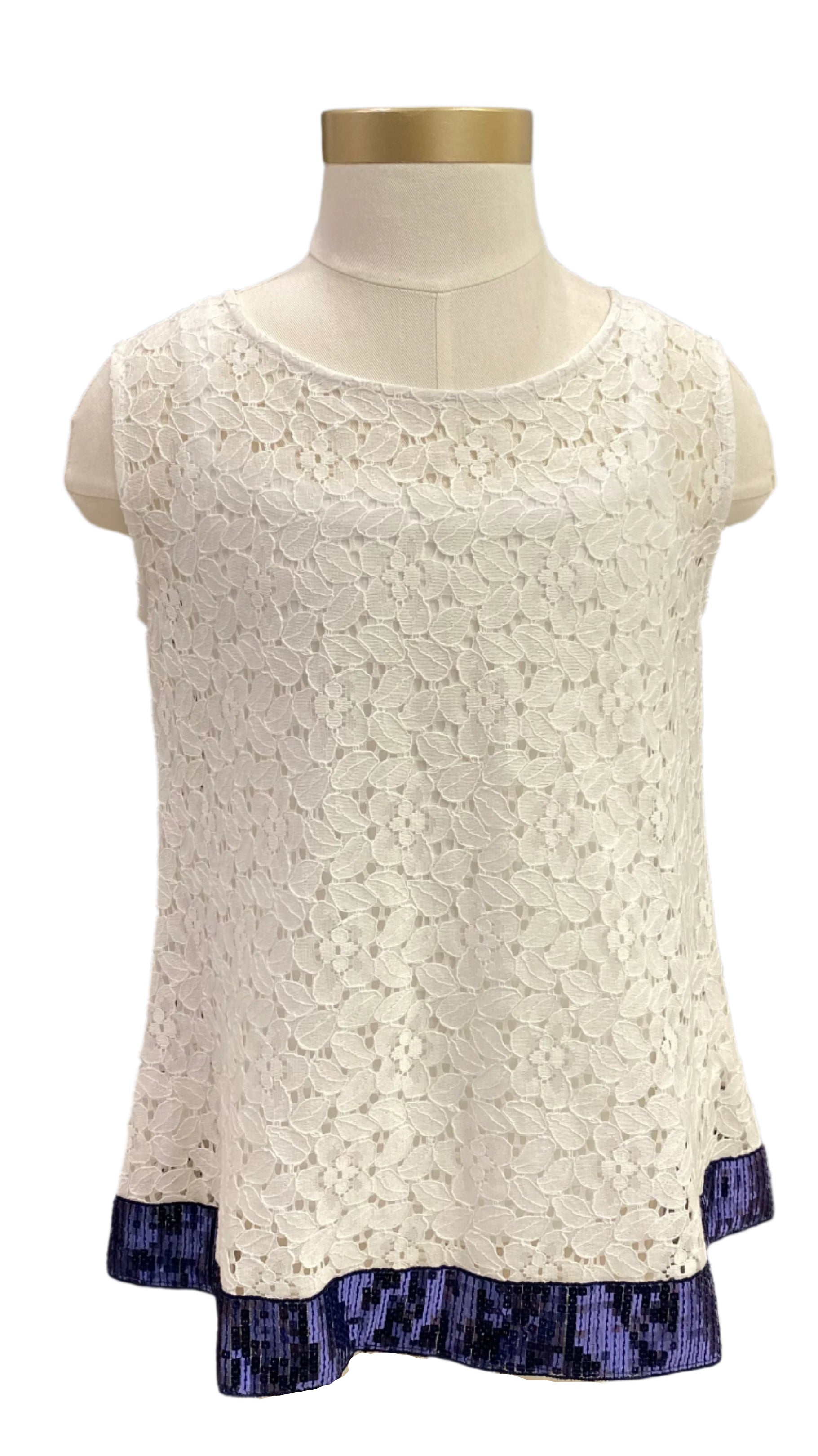 A semi-wide neck, sleeveless lace blouse. It is designed with shiny blue sequins all over the hem. Made in Italy by ELSY.