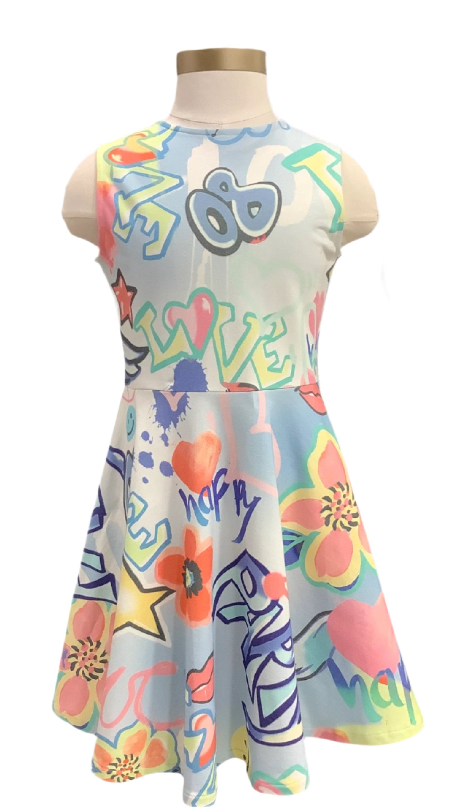 An all over printed emoji dress from ELSY. It is sleeveless and is zip-up back opening. Semi-flounce at the bottom. Made in Italy.