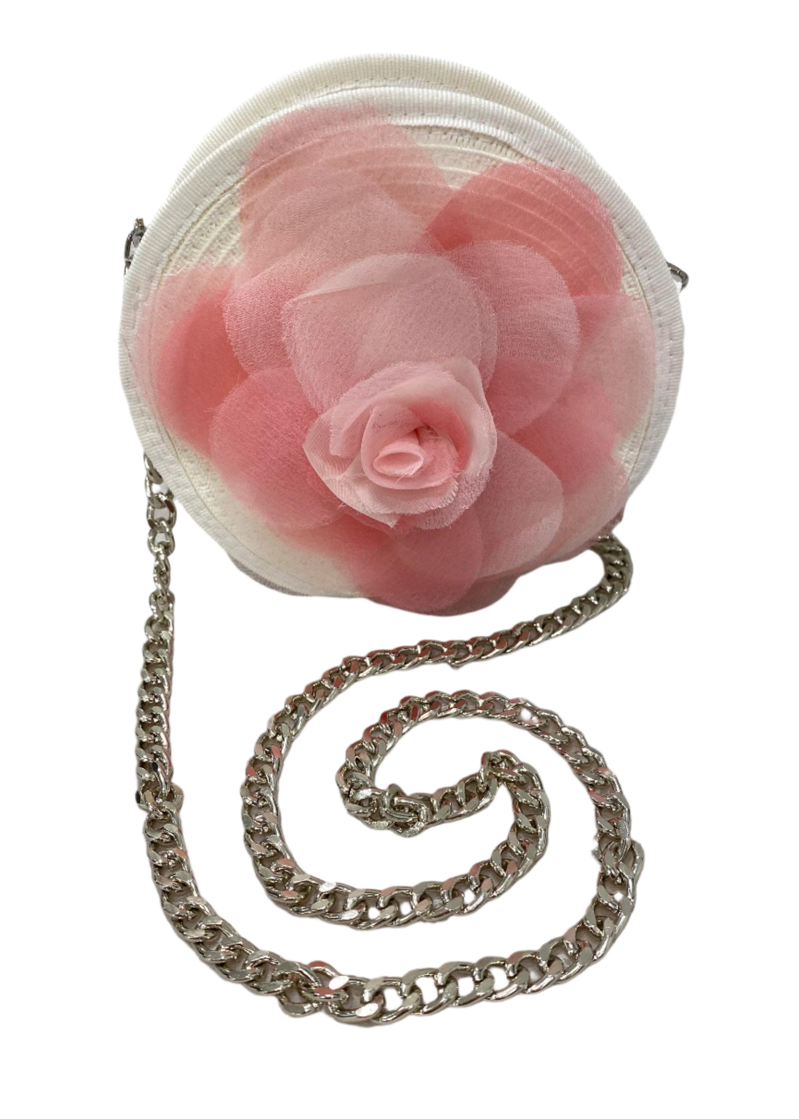 Pretty, silver chain strap round handbag, designed with pink flower applique in organza fabric. A product of ELSY from Italy.