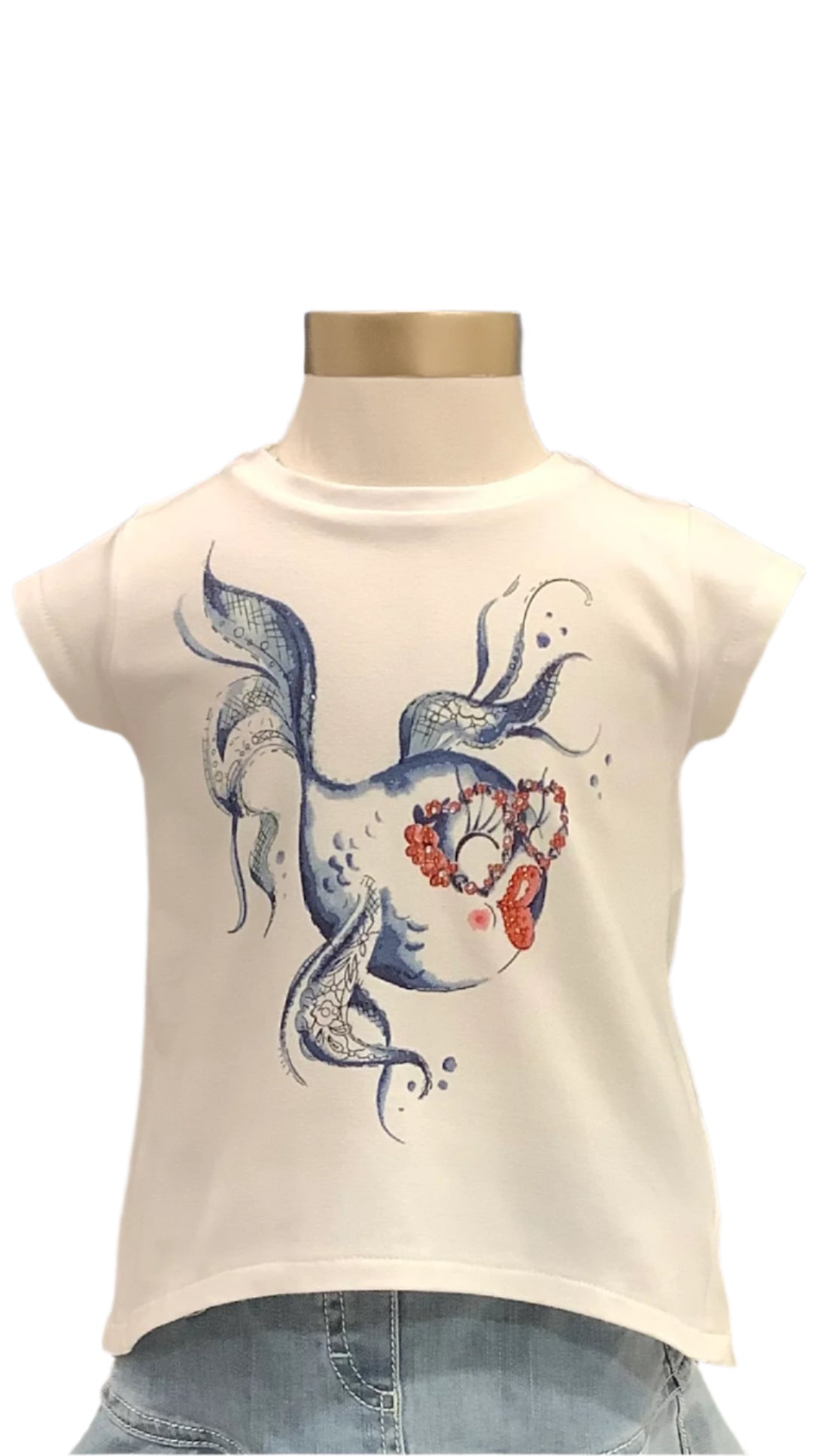 A denim flare skirt that has three pockets on the front with pearls and crystals on the edge. It is matched with flare octopus printed top with red crystals. The top has a lovely heart shape mesh fabric at the back with stripe small bow. Made in Italy by Elsy.