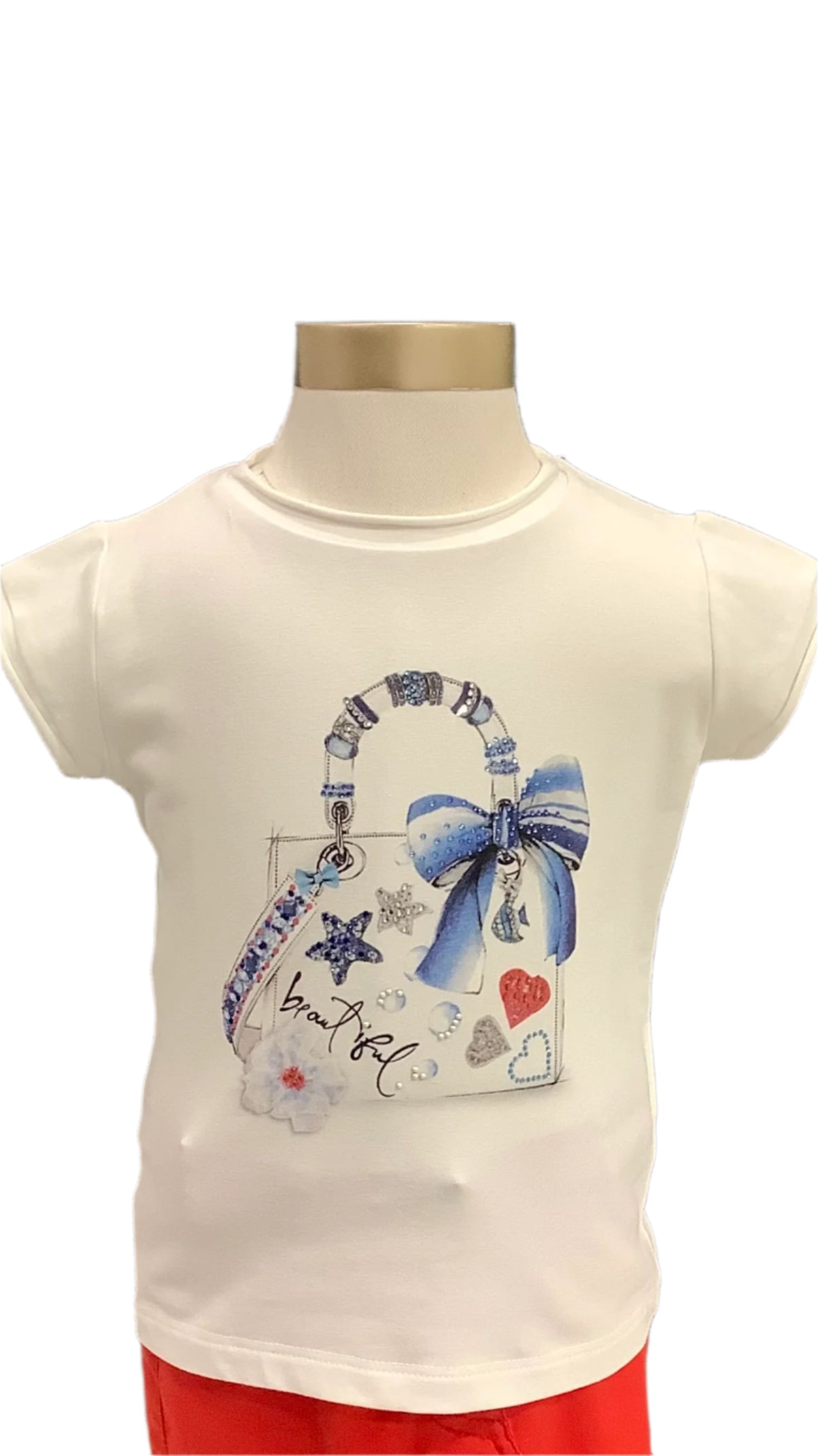 A white top printed with stylish handbag enhanced with studs and crystals. This top is matched with chic red skirt that is ragged on the hem. Made in Italy by ELSY.