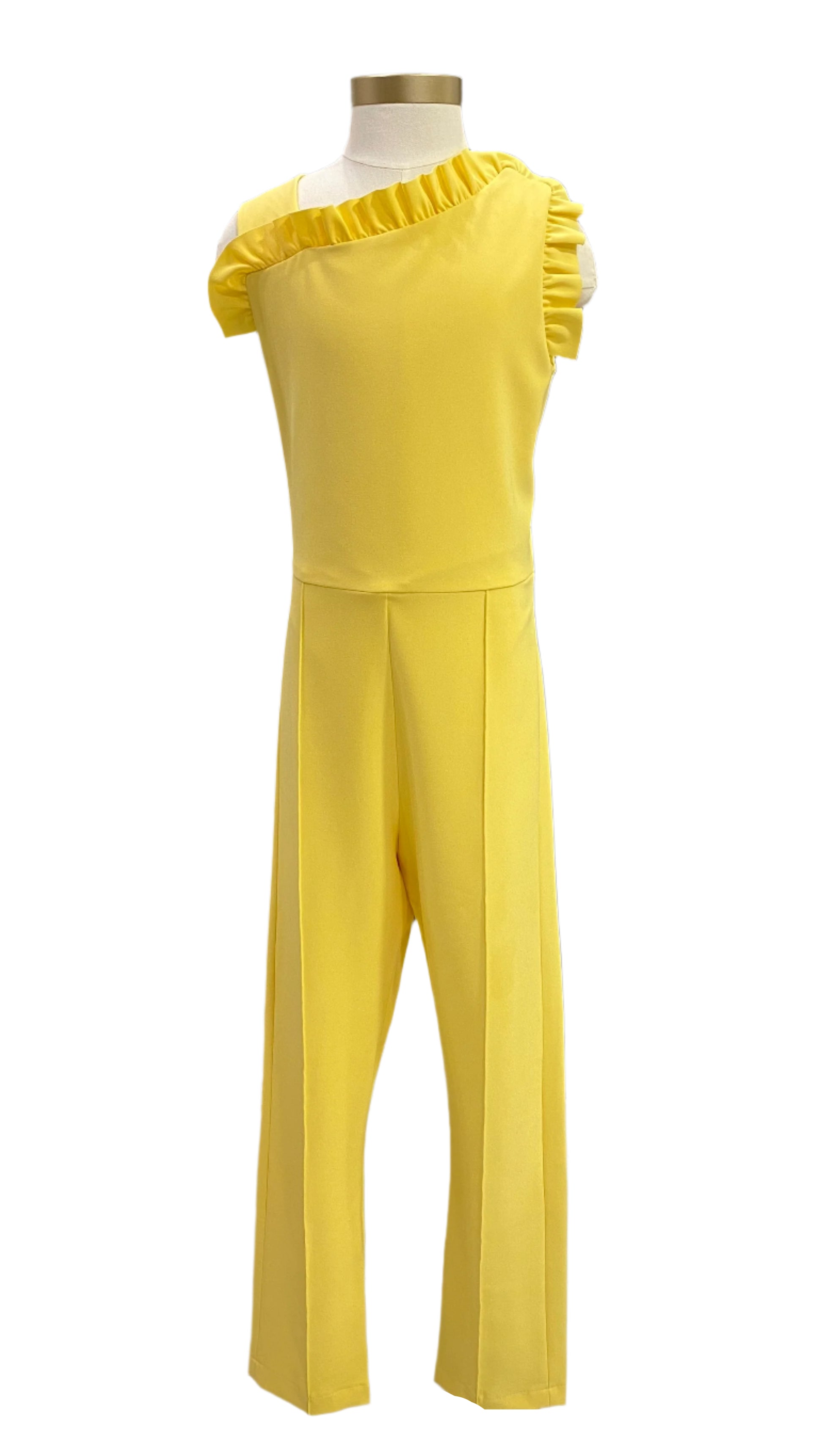 Made in soft fabric. Sleeveless ruffled neckline yellow jumpsuit. Has slide fastening at the back.