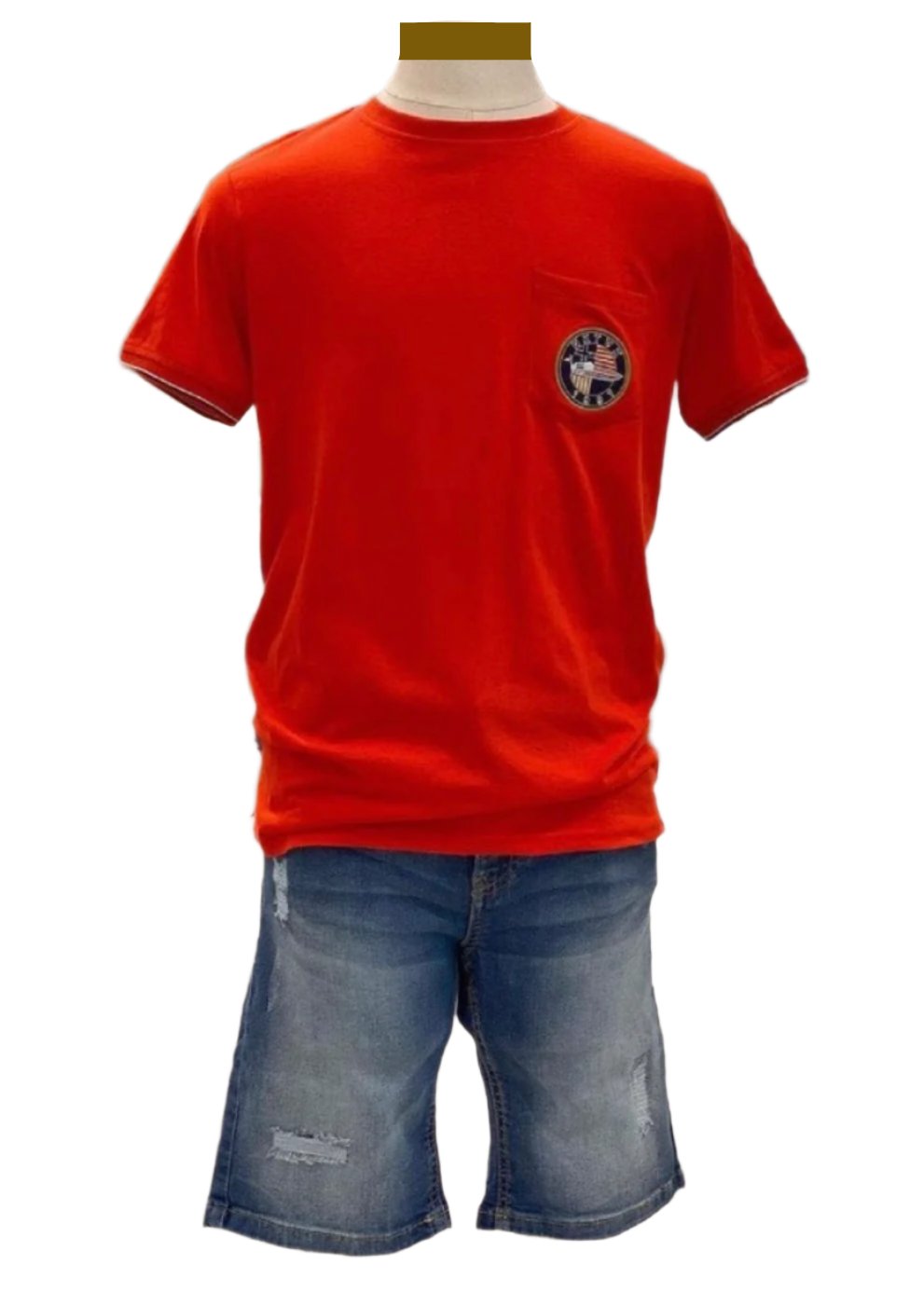Red t-shirt and has smooth texture knitwear good for summer heat. Contrast knit on the sleeves. Has chest pocket with embroidered emblem 'NKTVK'. Has small slits on the sides with colored tape edging. Denim shorts has belt loops, elasticated waistband, zipper and button for fastening. Also it has five pockets.